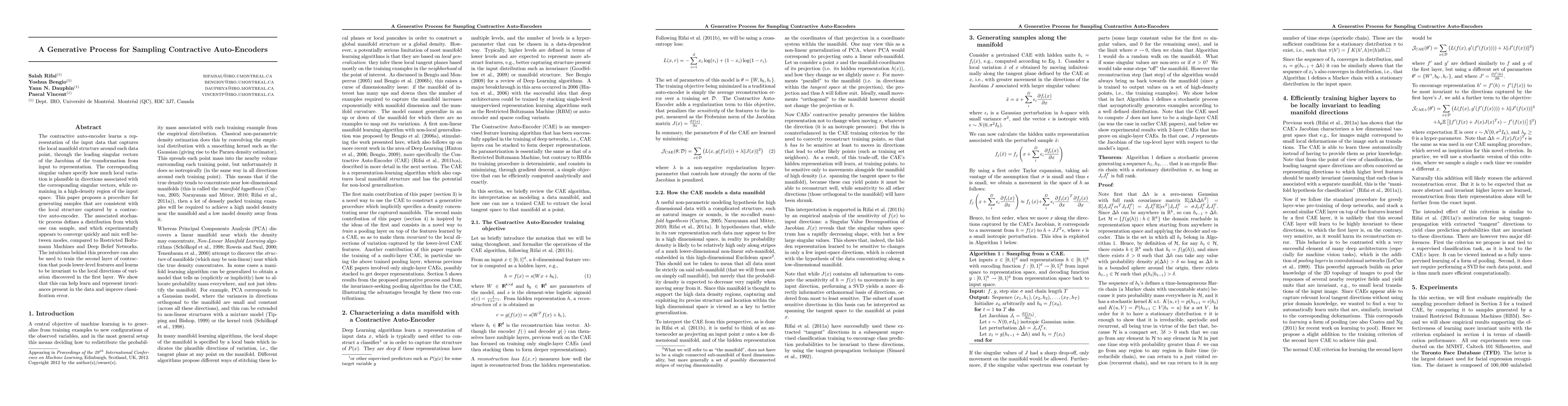 The contractive auto-encoder learns a representation of the input data that captures the local manifold structure around each data point, through the leading singular vectors of the Jacobian of the transformation from input to representation. The corresponding singular values specify how much local variation is plausible in directions associated with the corresponding singular vectors, while remaining in a high-density region of the input space. This paper proposes a procedure for generating samples that are consistent with the local structure captured by a contractive auto-encoder. The associated stochastic process defines a distribution from which one can sample, and which experimentally appears to converge quickly and mix well between modes, compared to Restricted Boltzmann Machines and Deep Belief Networks. The intuitions behind this procedure can also be used to train the second layer of contraction that pools lower-level features and learns to be invariant to the local directions of variation discovered in the first layer. We show that this can help learn and represent invariances present in the data and improve classification error.
