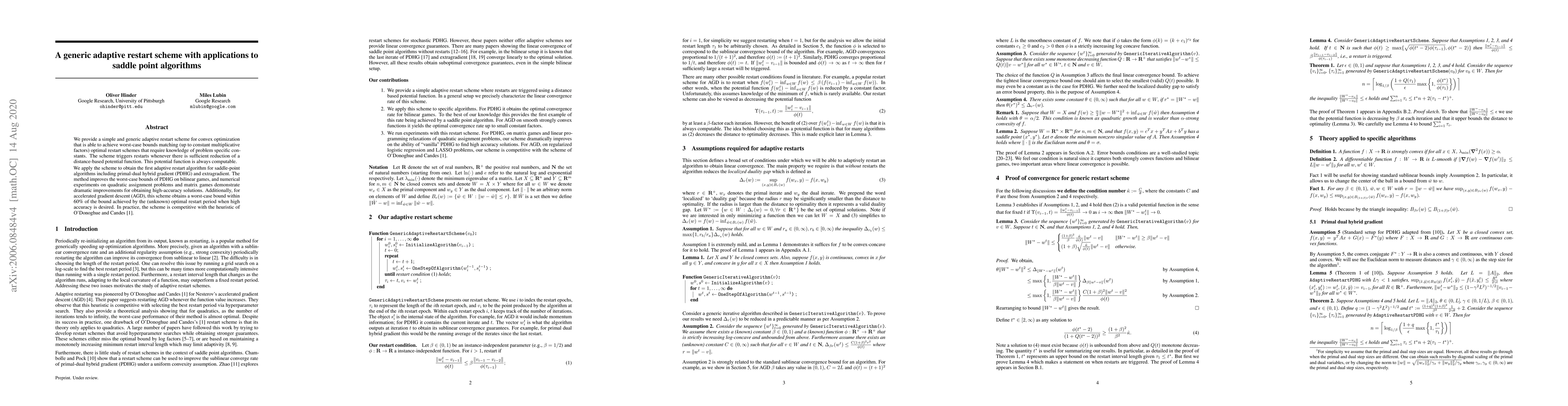 This paper introduces a generic adaptive restart scheme for convex optimization that matches optimal restart schemes without requiring problem-specific constants. The scheme is applied to saddle-point algorithms, notably improving the PDHG method for bilinear games and demonstrating significant performance gains in numerical experiments on quadratic assignment problems.