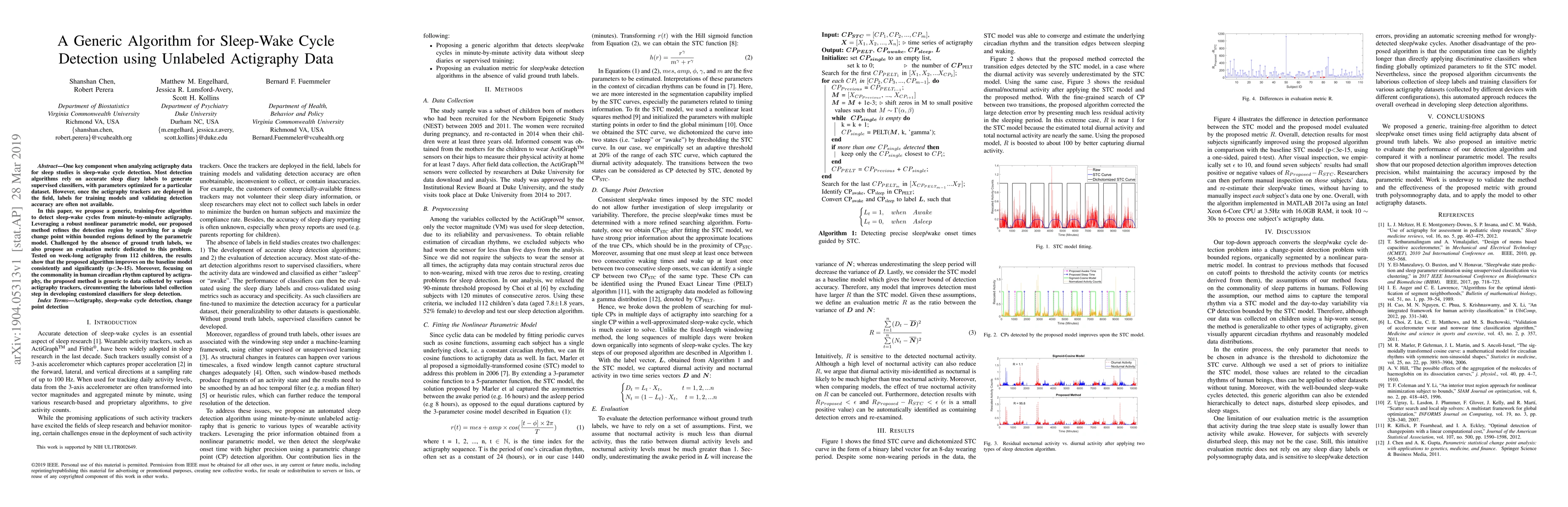 One key component when analyzing actigraphy data for sleep studies is sleep-wake cycle detection. Most detection algorithms rely on accurate sleep diary labels to generate supervised classifiers, with parameters optimized for a particular dataset. However, once the actigraphy trackers are deployed in the field, labels for training models and validating detection accuracy are often not available. In this paper, we propose a generic, training-free algorithm to detect sleep-wake cycles from minute-by-minute actigraphy. Leveraging a robust nonlinear parametric model, our proposed method refines the detection region by searching for a single change point within bounded regions defined by the parametric model. Challenged by the absence of ground truth labels, we also propose an evaluation metric dedicated to this problem. Tested on week-long actigraphy from 112 children, the results show that the proposed algorithm improves on the baseline model consistently and significantly (p<3e-15). Moreover, focusing on the commonality in human circadian rhythm captured by actigraphy, the proposed method is generic to data collected by various actigraphy trackers, circumventing the laborious label collection step in developing customized classifiers for sleep detection.