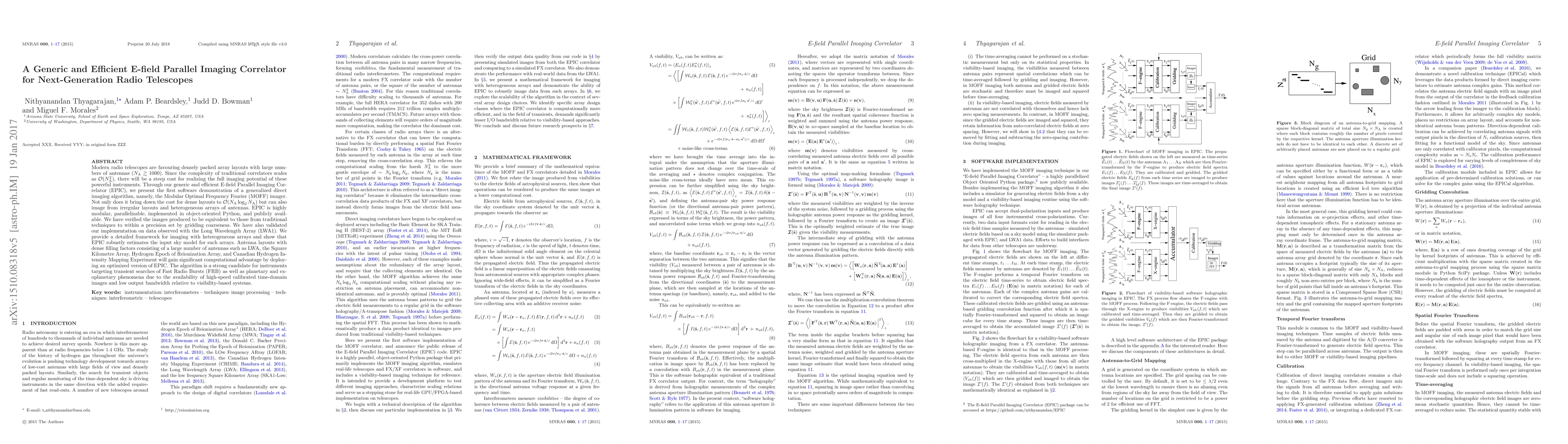 This paper introduces the E-field Parallel Imaging Correlator (EPIC), a novel software correlator for next-generation radio telescopes with large, dense antenna arrays. EPIC employs the Modular Optimal Frequency Fourier (MOFF) imager to reduce computational complexity from $\mathcal{O}(N_\textrm{A}^2)$ to $\mathcal{O}(N_\textrm{A}\log_2 N_\textrm{A})$, enabling efficient imaging from irregular and heterogeneous arrays.