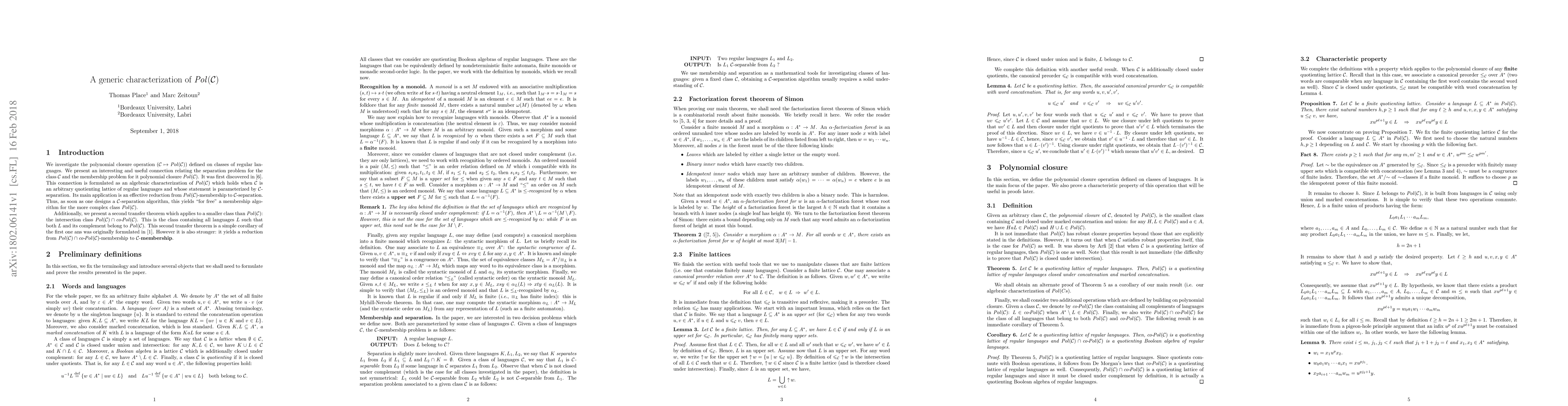 We investigate the polynomial closure operation (C -> Pol(C)) defined on classes of regular languages. We present an interesting and useful connection relating the separation problem for the class C and the membership problem for it polynomial closure Pol(C). This connection is formulated as an algebraic characterization of Pol(C) which holds when C is an arbitrary \pvari of regular languages and whose statement is parameterized by C-separation. Its main application is an effective reduction from Pol(C)-membership to C-separation. Thus, as soon as one designs a C-separation algorithm, this yields "for free" a membership algorithm for the more complex class Pol(C).
