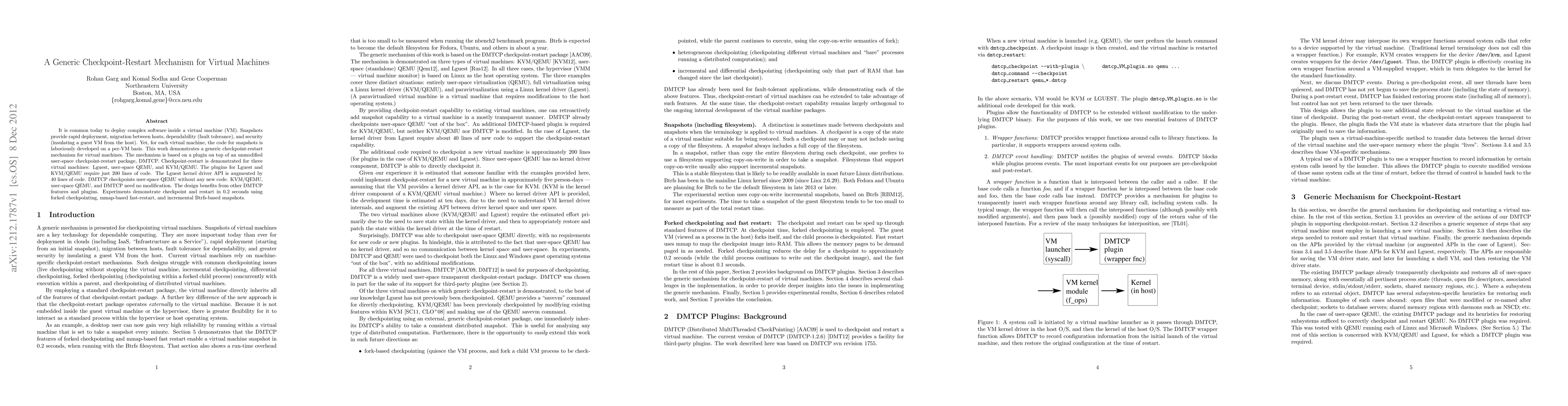 This paper presents a generic checkpoint-restart mechanism for virtual machines using a lightweight DMTCP plugin, enabling rapid deployment and fault tolerance without requiring modifications to the VMs or host systems. Experiments show successful checkpointing and restart in 0.2 seconds for Lguest, user-space QEMU, and KVM/QEMU.