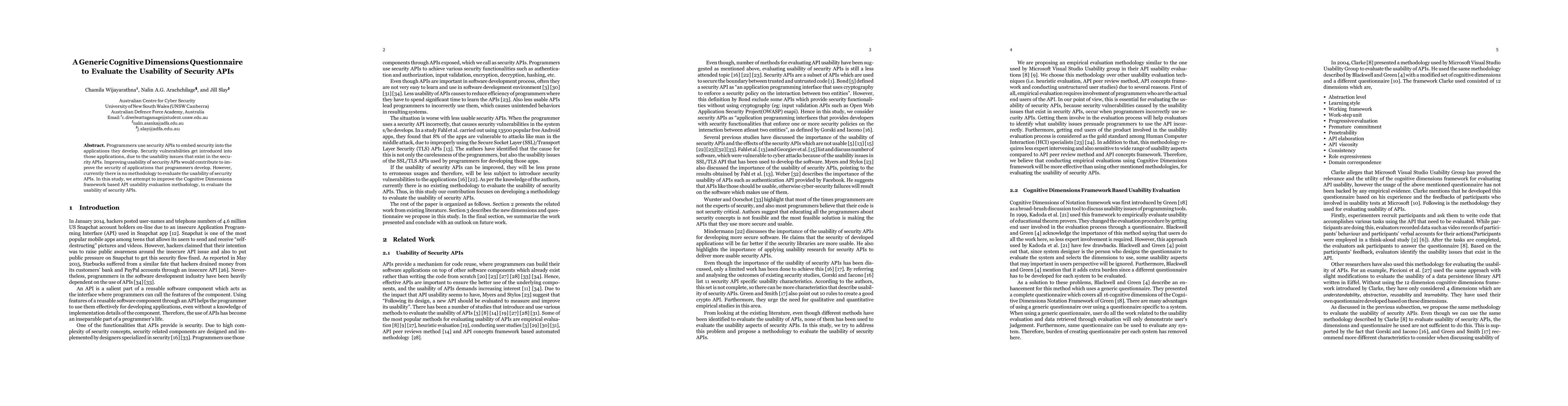 This study enhances the Cognitive Dimensions framework to develop a generic questionnaire for evaluating the usability of security APIs, aiming to identify usability issues that could lead to security vulnerabilities in applications. The proposed methodology seeks to improve the security of software by addressing these usability challenges.