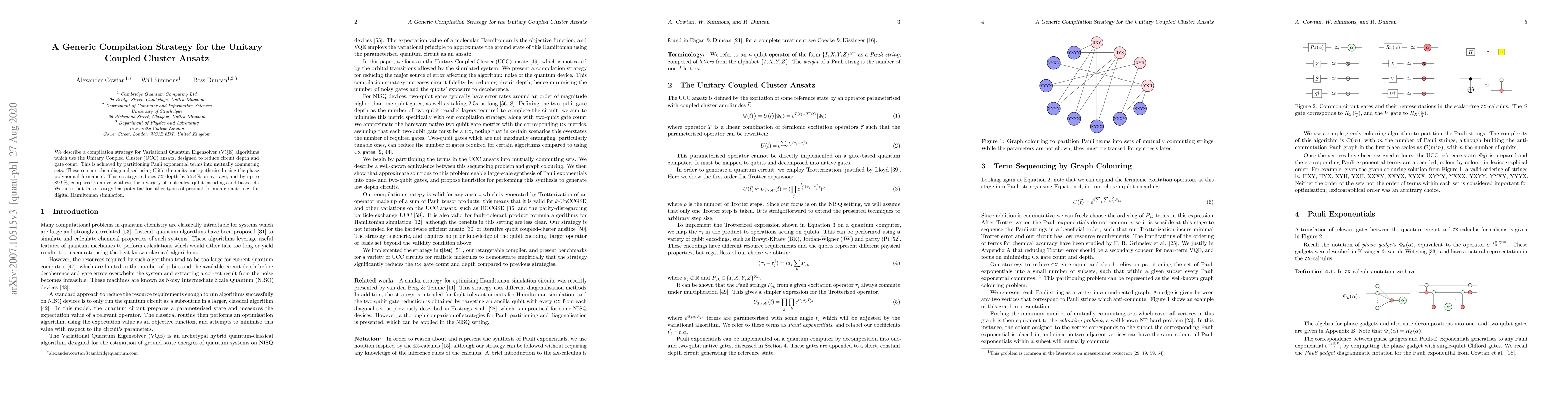 We describe a compilation strategy for Variational Quantum Eigensolver (VQE) algorithms which use the Unitary Coupled Cluster (UCC) ansatz, designed to reduce circuit depth and gate count. This is achieved by partitioning Pauli exponential terms into mutually commuting sets. These sets are then diagonalised using Clifford circuits and synthesised using the phase polynomial formalism. This strategy reduces cx depth by 75.4% on average, and by up to 89.9%, compared to naive synthesis for a variety of molecules, qubit encodings and basis sets.