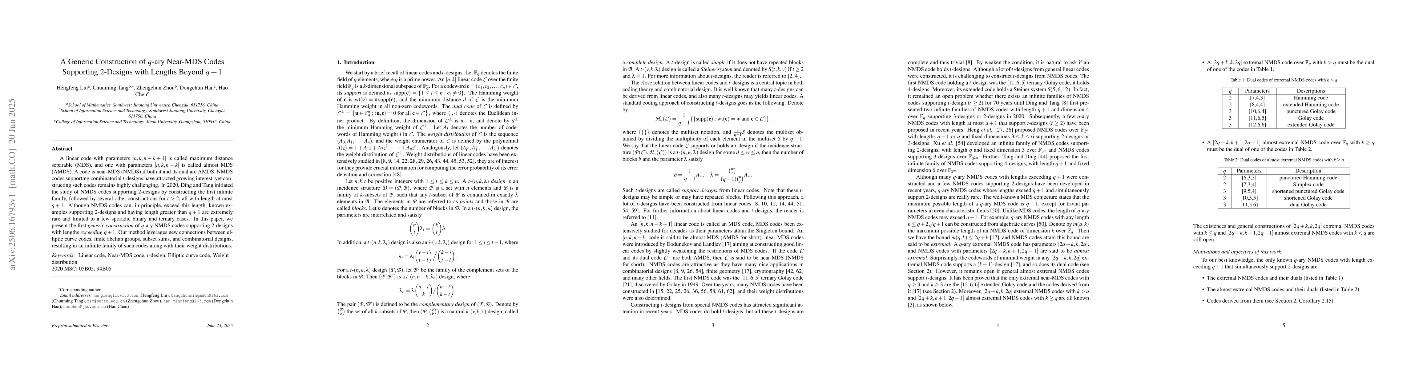 A linear code with parameters $[n, k, n - k + 1]$ is called maximum distance separable (MDS), and one with parameters $[n, k, n - k]$ is called almost MDS (AMDS). A code is near-MDS (NMDS) if both it and its dual are AMDS. NMDS codes supporting combinatorial $t$-designs have attracted growing interest, yet constructing such codes remains highly challenging. In 2020, Ding and Tang initiated the study of NMDS codes supporting 2-designs by constructing the first infinite family, followed by several other constructions for $t > 2$, all with length at most $q + 1$. Although NMDS codes can, in principle, exceed this length, known examples supporting 2-designs and having length greater than $q + 1$ are extremely rare and limited to a few sporadic binary and ternary cases. In this paper, we present the first \emph{generic construction} of $q$-ary NMDS codes supporting 2-designs with lengths \emph{exceeding $q + 1$}. Our method leverages new connections between elliptic curve codes, finite abelian groups, subset sums, and combinatorial designs, resulting in an infinite family of such codes along with their weight distributions.