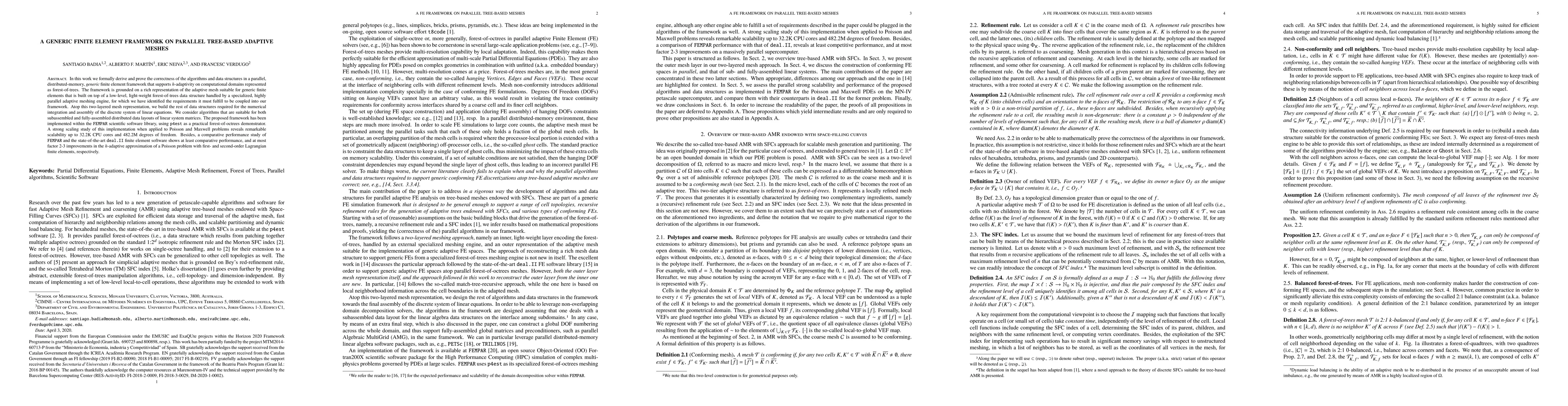 This paper presents a parallel, distributed-memory finite element framework supporting h-adaptivity on forest-of-trees meshes, demonstrating strong scalability up to 32.2K CPU cores. The framework shows competitive performance compared to state-of-the-art software, achieving up to 3x improvements in adaptive meshing for Poisson problems.
