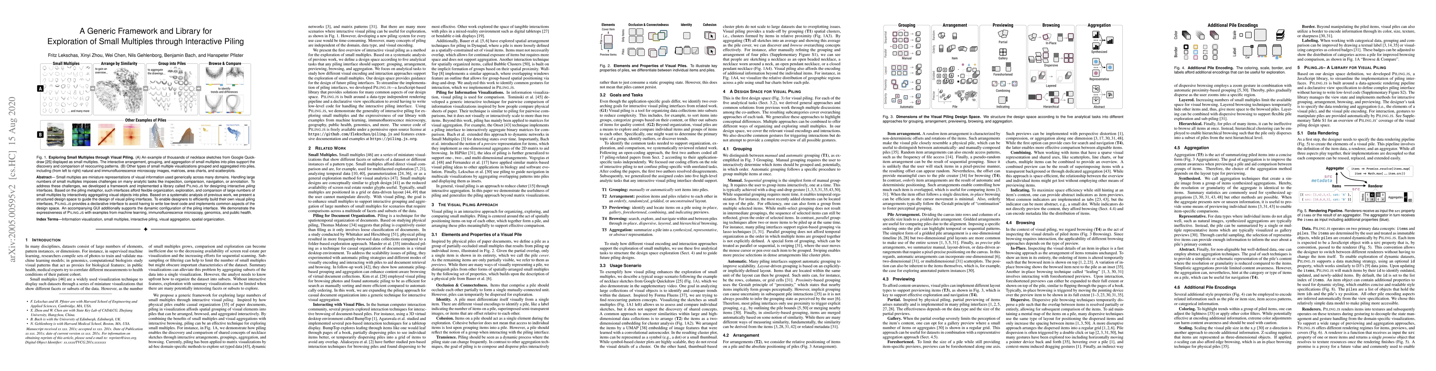 This paper introduces a framework and library, Piling.js, for designing interactive piling interfaces to explore large numbers of small multiples. The framework provides a structured design space and a declarative interface to facilitate the creation of visual piling interfaces, enabling flexible organization and comparison of visual data.
