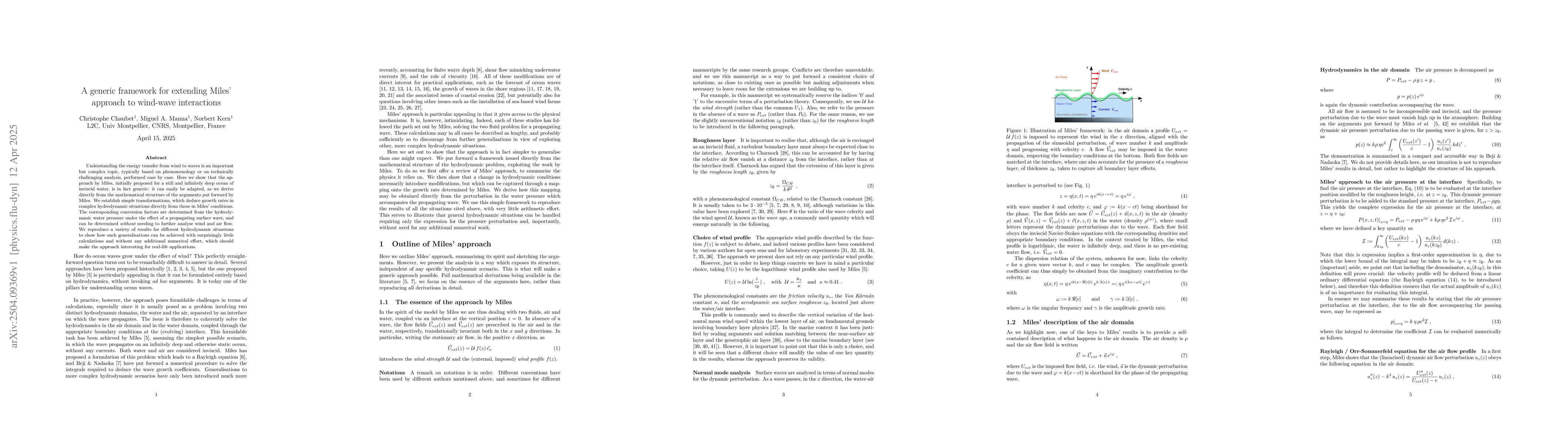 The paper presents a generic framework extending Miles' approach to wind-wave interactions by focusing on the pressure balance at the water-air interface, characterized by a single coefficient P0 that relates the dynamic water pressure perturbation in the water domain to that in Miles' conditions, plus any interfacial terms.