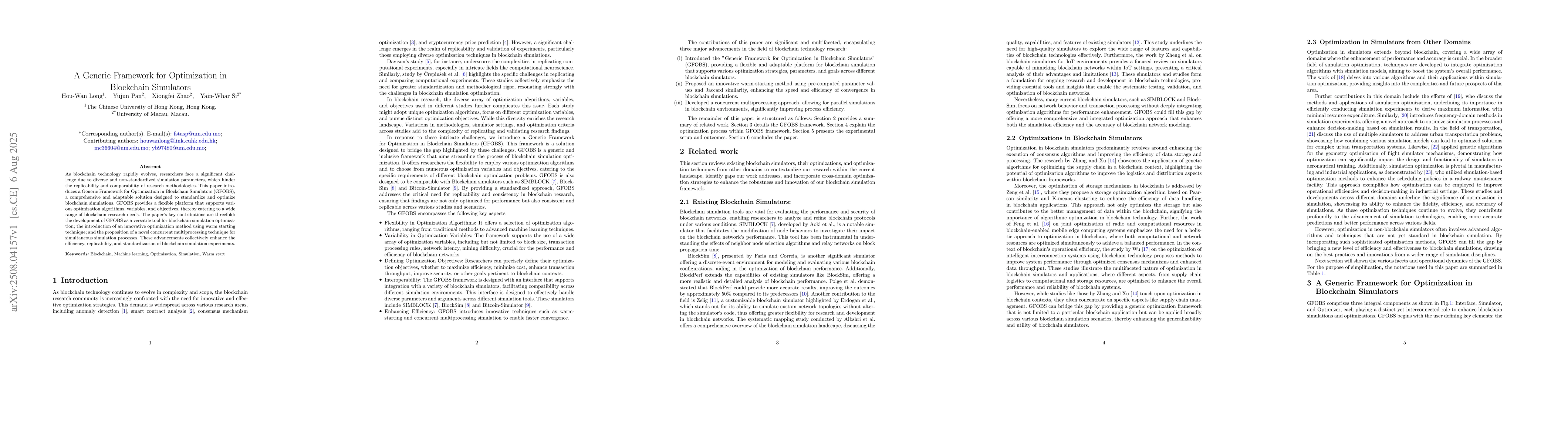 As blockchain technology rapidly evolves, researchers face a significant challenge due to diverse and non-standardized simulation parameters, which hinder the replicability and comparability of research methodologies. This paper introduces a Generic Framework for Optimization in Blockchain Simulators (GFOBS), a comprehensive and adaptable solution designed to standardize and optimize blockchain simulations. GFOBS provides a flexible platform that supports various optimization algorithms, variables, and objectives, thereby catering to a wide range of blockchain research needs. The paper's key contributions are threefold: the development of GFOBS as a versatile tool for blockchain simulation optimization; the introduction of an innovative optimization method using warm starting technique; and the proposition of a novel concurrent multiprocessing technique for simultaneous simulation processes. These advancements collectively enhance the efficiency, replicability, and standardization of blockchain simulation experiments.