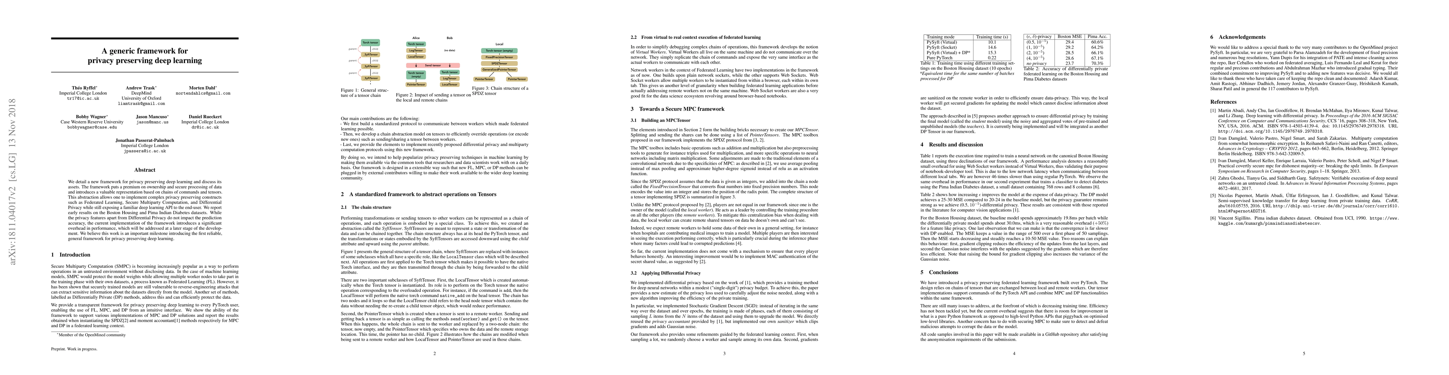 This paper introduces a novel framework for privacy-preserving deep learning that emphasizes data ownership and secure processing. The framework employs a command-tensor abstraction to implement privacy techniques like Federated Learning and Differential Privacy, maintaining a user-friendly deep learning API. Initial results show no loss in accuracy but note performance overhead, which is expected to improve.