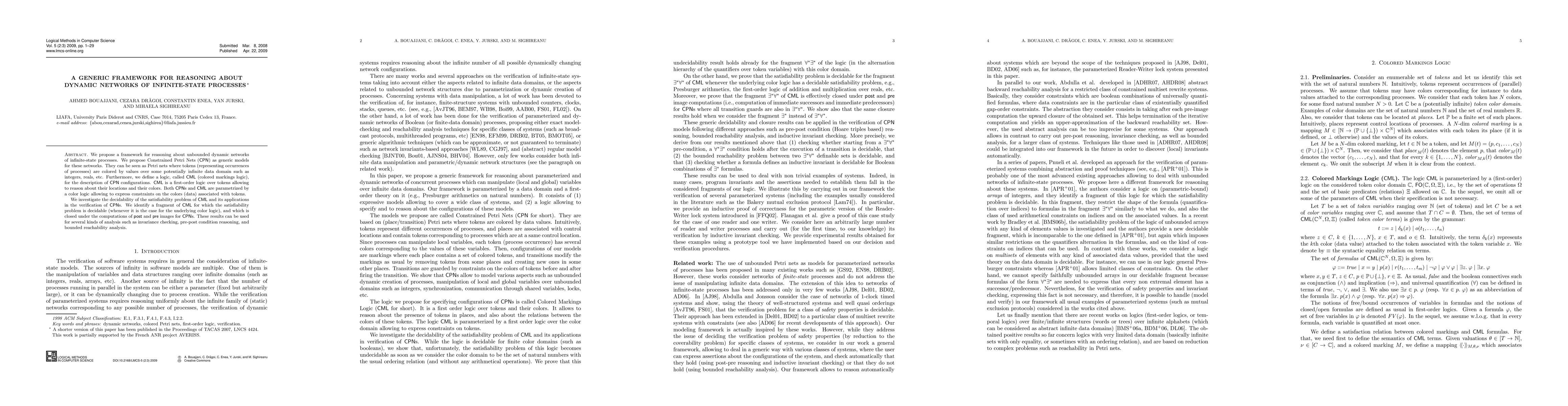This paper introduces a framework using Constrained Petri Nets (CPN) to model dynamic networks of infinite-state processes, employing a logic called CML for reasoning about their configurations. It establishes decidability for a specific fragment of CML, enabling applications like invariance checking and bounded reachability analysis.