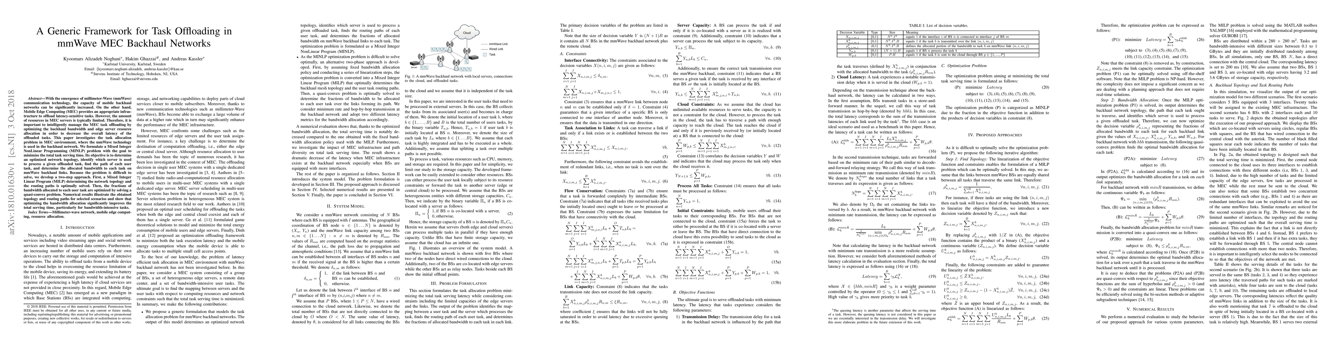 This paper proposes a framework for optimizing task offloading in mmWave-based Mobile Edge Computing (MEC) networks, aiming to minimize latency by efficiently managing backhaul bandwidth and edge server resources. The authors develop a two-step approach: first solving a Mixed Integer Linear Program (MILP) for network topology and routing, followed by optimizing bandwidth allocation via a quasi-convex problem, demonstrating significant reductions in total task serving time.
