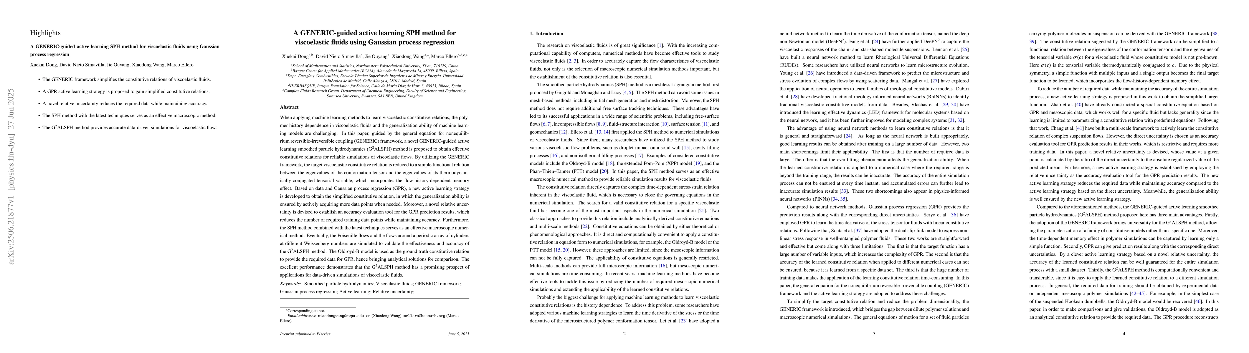 The paper introduces a novel G^2ALSPH method that combines the GENERIC framework, active learning, and Gaussian process regression for viscoelastic fluid simulations, ensuring accurate and generalizable constitutive relations.