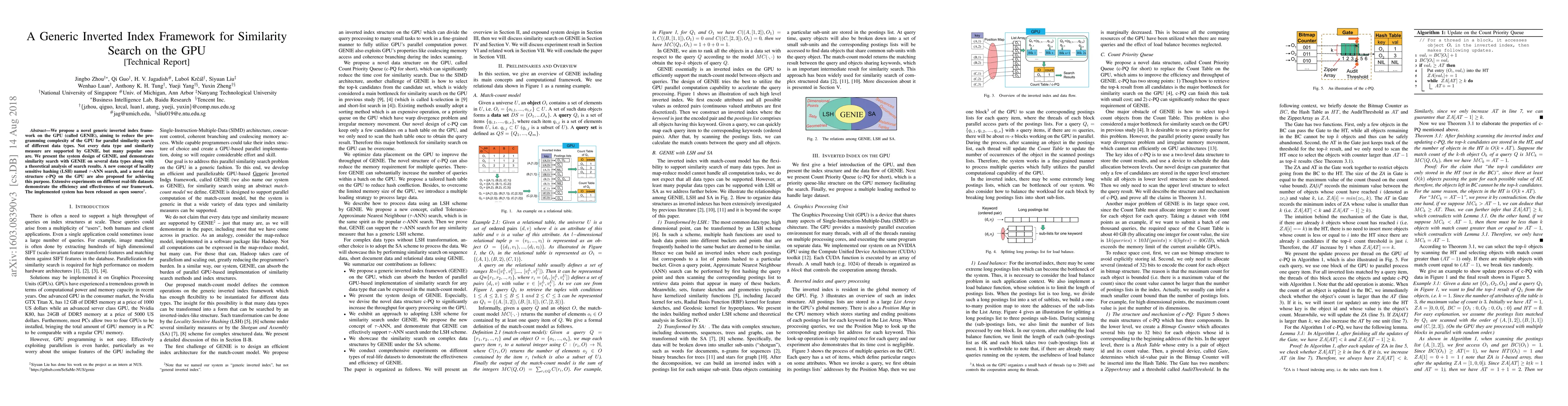 This paper introduces GENIE, a GPU-based inverted index framework for parallel similarity search, designed to simplify programming complexity. The framework supports many popular data types and similarity measures, employing novel techniques like $\tau$-ANN search and c-PQ data structure for efficient search. Experimental results show its effectiveness on various real-life datasets.