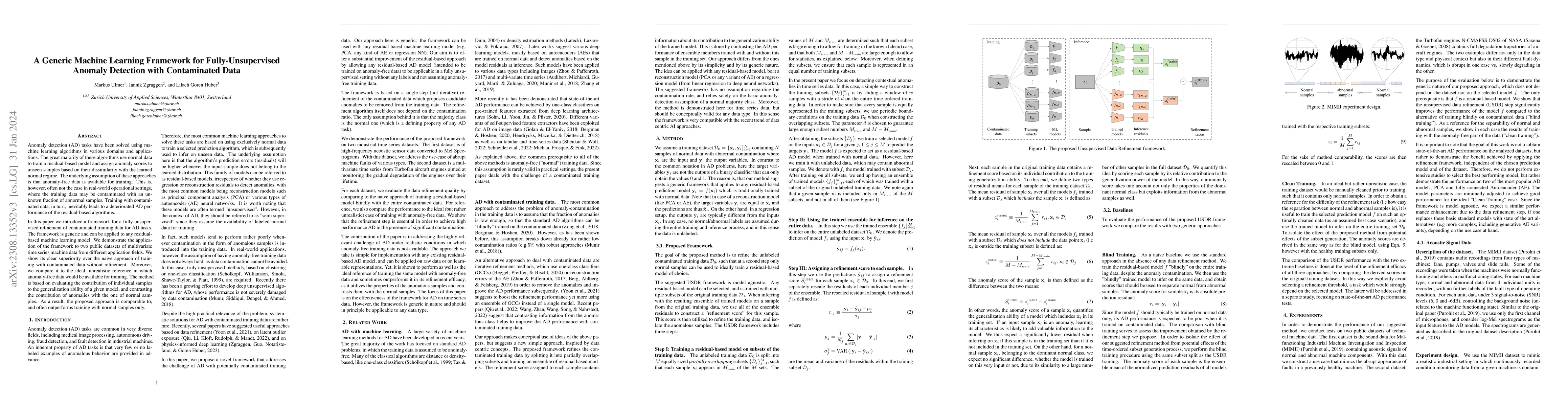 Anomaly detection (AD) tasks have been solved using machine learning algorithms in various domains and applications. The great majority of these algorithms use normal data to train a residual-based model and assign anomaly scores to unseen samples based on their dissimilarity with the learned normal regime. The underlying assumption of these approaches is that anomaly-free data is available for training. This is, however, often not the case in real-world operational settings, where the training data may be contaminated with an unknown fraction of abnormal samples. Training with contaminated data, in turn, inevitably leads to a deteriorated AD performance of the residual-based algorithms. In this paper we introduce a framework for a fully unsupervised refinement of contaminated training data for AD tasks. The framework is generic and can be applied to any residual-based machine learning model. We demonstrate the application of the framework to two public datasets of multivariate time series machine data from different application fields. We show its clear superiority over the naive approach of training with contaminated data without refinement. Moreover, we compare it to the ideal, unrealistic reference in which anomaly-free data would be available for training. The method is based on evaluating the contribution of individual samples to the generalization ability of a given model, and contrasting the contribution of anomalies with the one of normal samples. As a result, the proposed approach is comparable to, and often outperforms training with normal samples only.