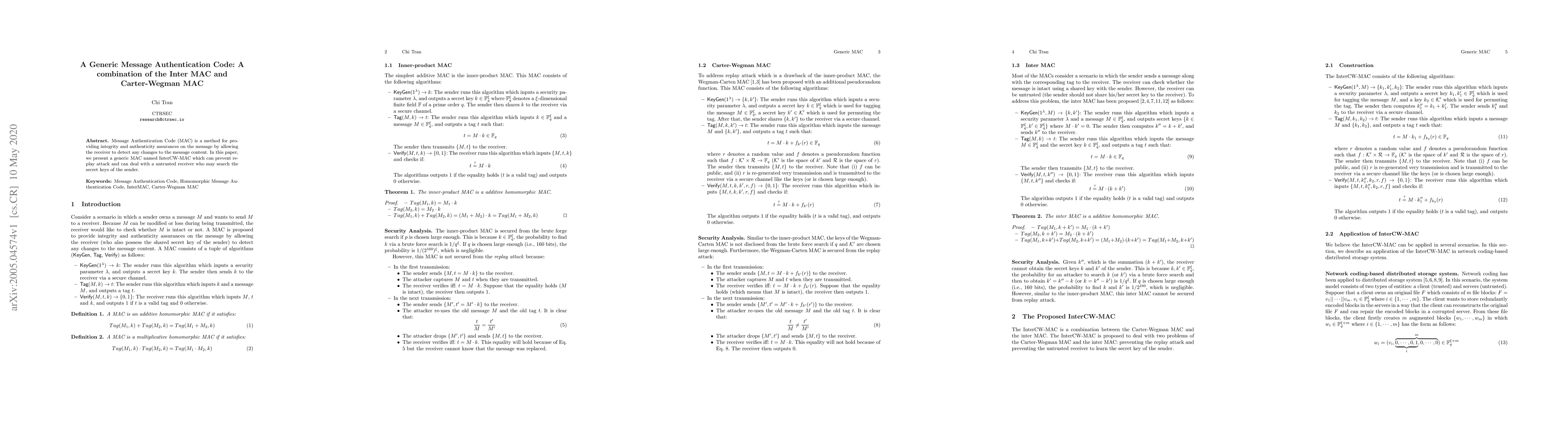 This paper introduces InterCW-MAC, a novel generic Message Authentication Code combining Inter MAC and Carter-Wegman MAC to ensure message integrity and authenticity, while also protecting against replay attacks and untrusted receivers.