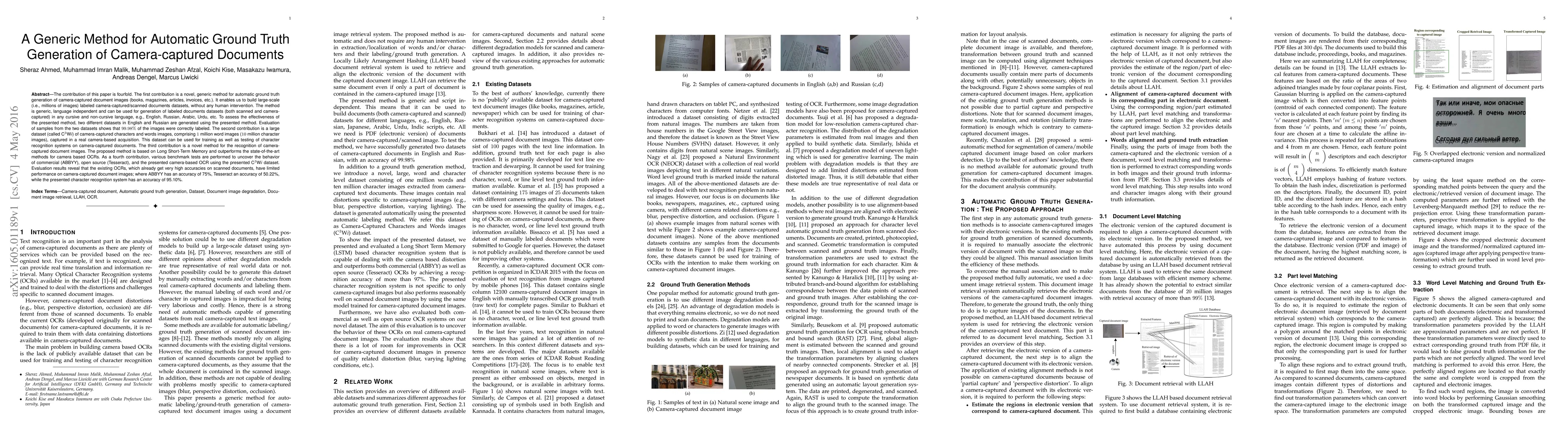 This paper presents a generic method for automatic ground truth generation for camera-captured document images, enabling large-scale labeled datasets without human intervention. It introduces a novel dataset (C3Wi) and a superior camera-based OCR method based on Long Short-Term Memory, achieving 95.10% accuracy compared to 75% for ABBYY and 50.22% for Tesseract on camera-captured documents.