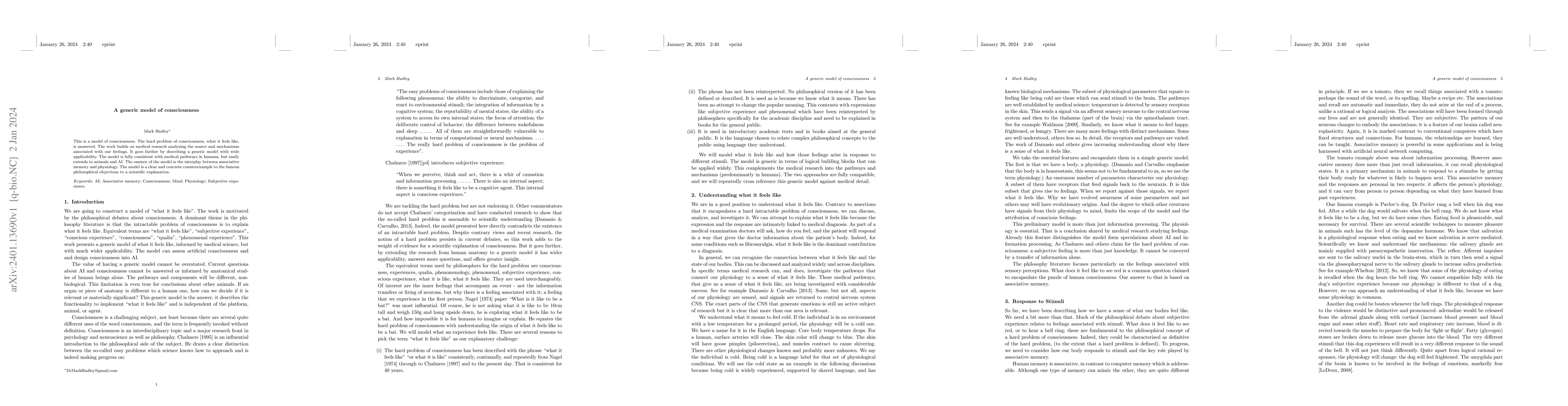 This paper presents a generic model of consciousness that explains the "hard problem" by detailing the interplay between associative memory and physiological processes, consistent with medical research, and applicable across humans, animals, and AI. It counters philosophical objections to scientific explanations of consciousness.