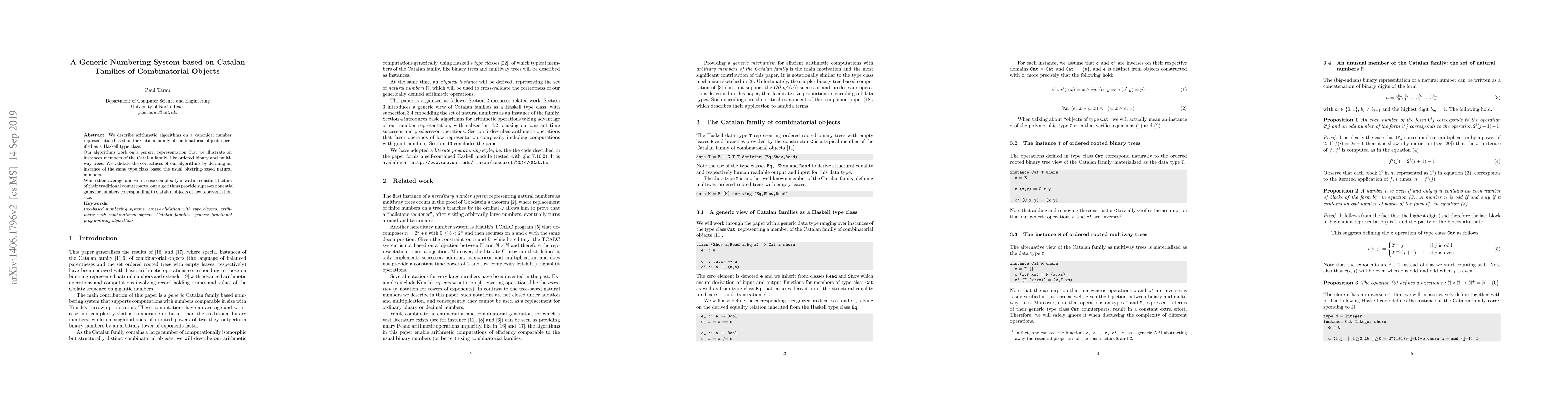 We describe arithmetic algorithms on a canonical number representation based on the Catalan family of combinatorial objects specified as a Haskell type class. Our algorithms work on a {\em generic} representation that we illustrate on instances members of the Catalan family, like ordered binary and multiway trees. We validate the correctness of our algorithms by defining an instance of the same type class based the usual bitstring-based natural numbers. While their average and worst case complexity is within constant factors of their traditional counterparts, our algorithms provide super-exponential gains for numbers corresponding to Catalan objects of low representation size.