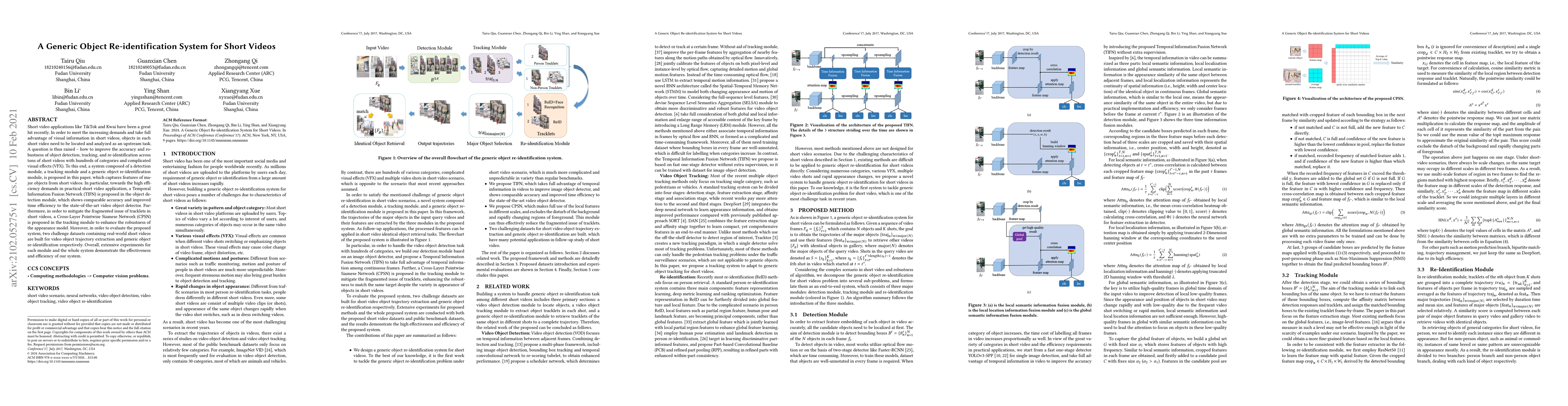 This paper proposes a generic object re-identification system for short videos, featuring a detection module with a Temporal Information Fusion Network (TIFN), a tracking module with a Cross-Layer Pointwise Siamese Network (CPSN), and a re-identification module. The system aims to improve accuracy and robustness in detecting, tracking, and identifying objects across numerous short video categories.