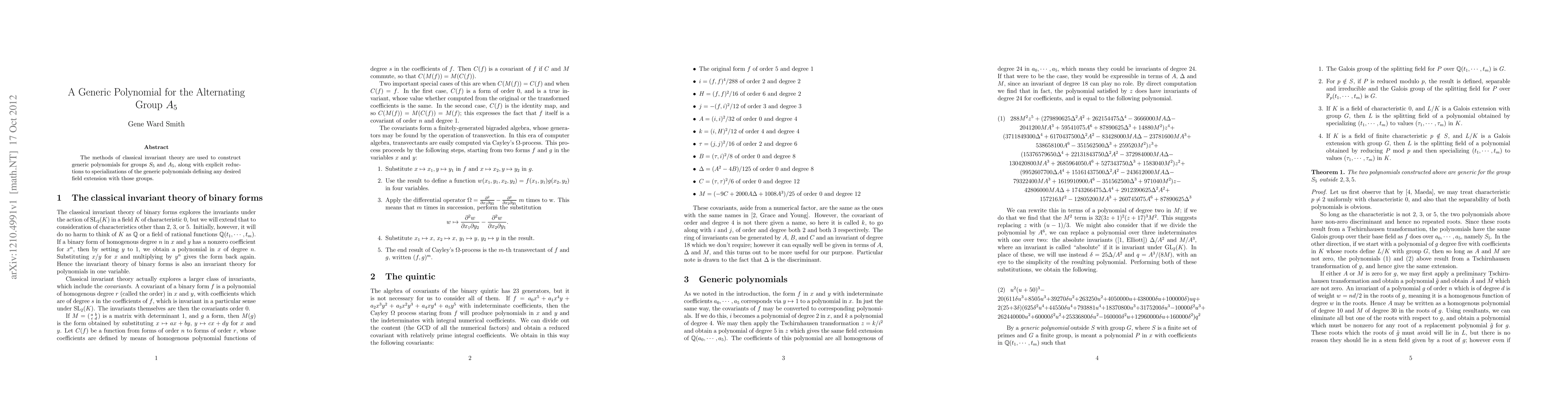 The methods of classical invariant theory are used to construct generic polynomials for groups $S_5$ and $A_5$, along with explicit reductions to specializations of the generic polynomials defining any desired field extension with those groups.