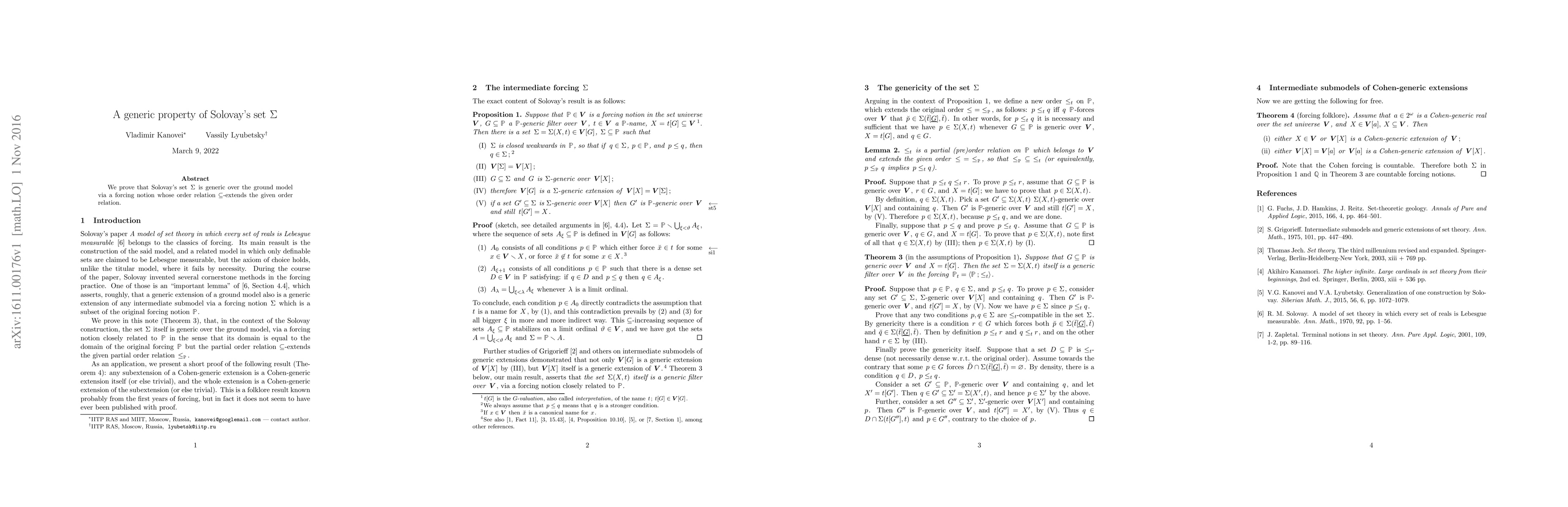Summary: This paper demonstrates that Solovay's set $\Sigma$ is generic over the ground model using a forcing notion where the order relation $\subseteq$-extends the given order, establishing a significant property of $\Sigma$.