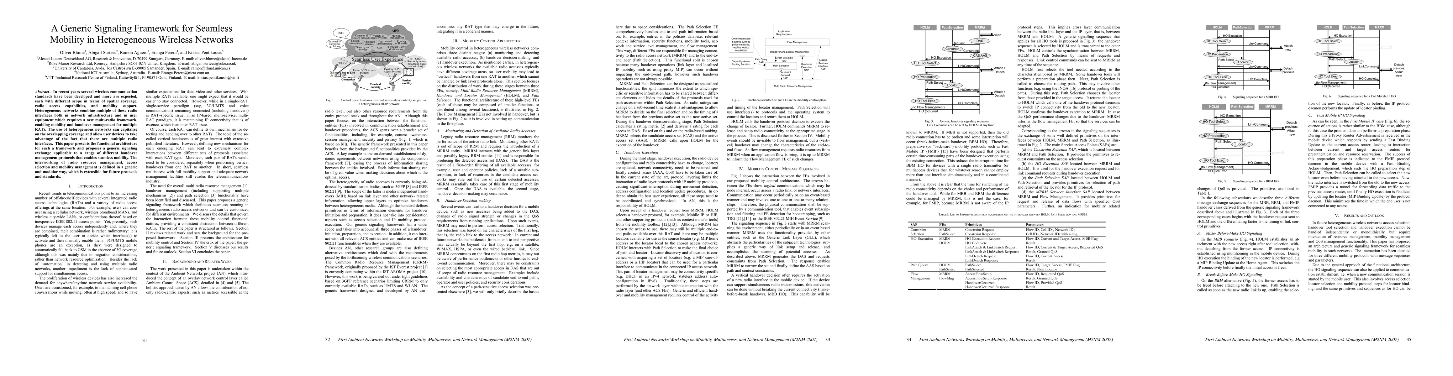 This paper introduces a generic signaling framework for managing seamless mobility across heterogeneous wireless networks, proposing a modular architecture that supports multiple radio access technologies (RATs) and is adaptable for future standards. The framework aims to optimize interworking between radio resource management, access selection, and mobility management.