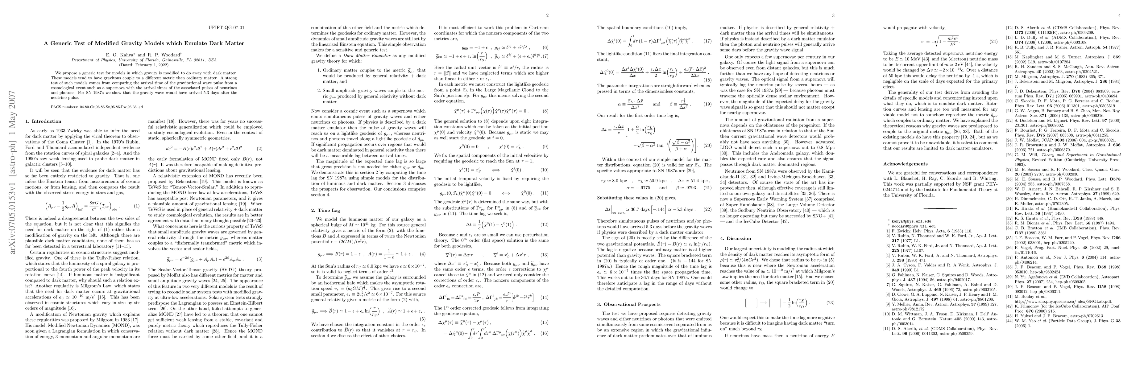 We propose a generic test for models in which gravity is modified to do away with dark matter. These models tend to have gravitons couple to a different metric than ordinary matter. A strong test of such models comes from comparing the arrival time of the gravitational wave pulse from a cosmological event such as a supernova with the arrival times of the associated pulses of neutrinos and photons. For SN 1987a we show that the gravity wave would have arrived 5.3 days after the neutrino pulse.