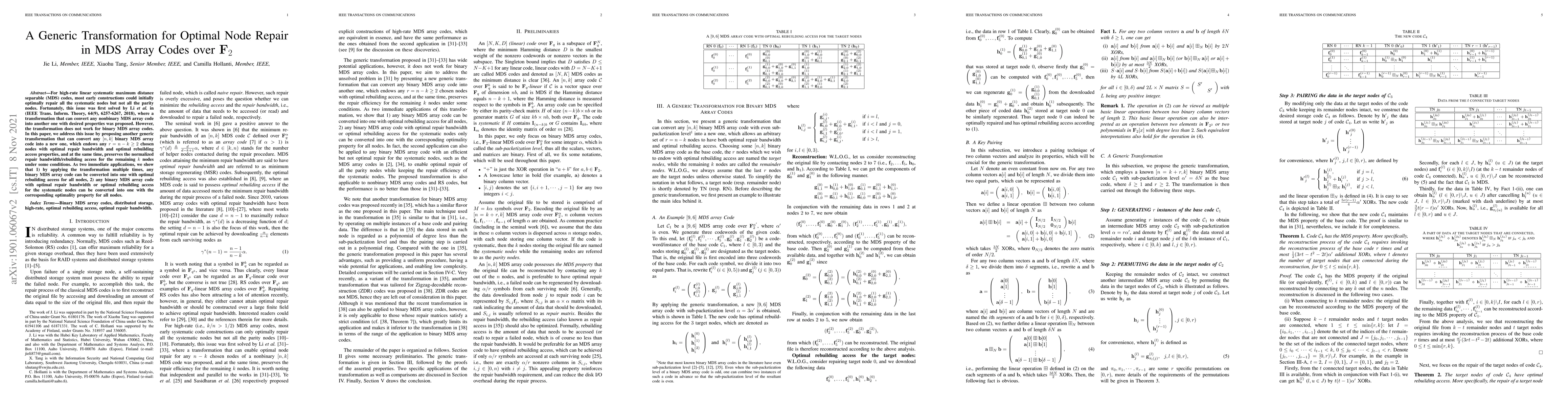 This paper proposes a generic transformation to convert any binary MDS array code into another with optimal repair bandwidth and rebuilding access for any chosen nodes, while preserving the properties for the remaining nodes. The transformation extends the solution by Li et al. to binary codes, enabling optimal properties for all nodes through multiple applications.