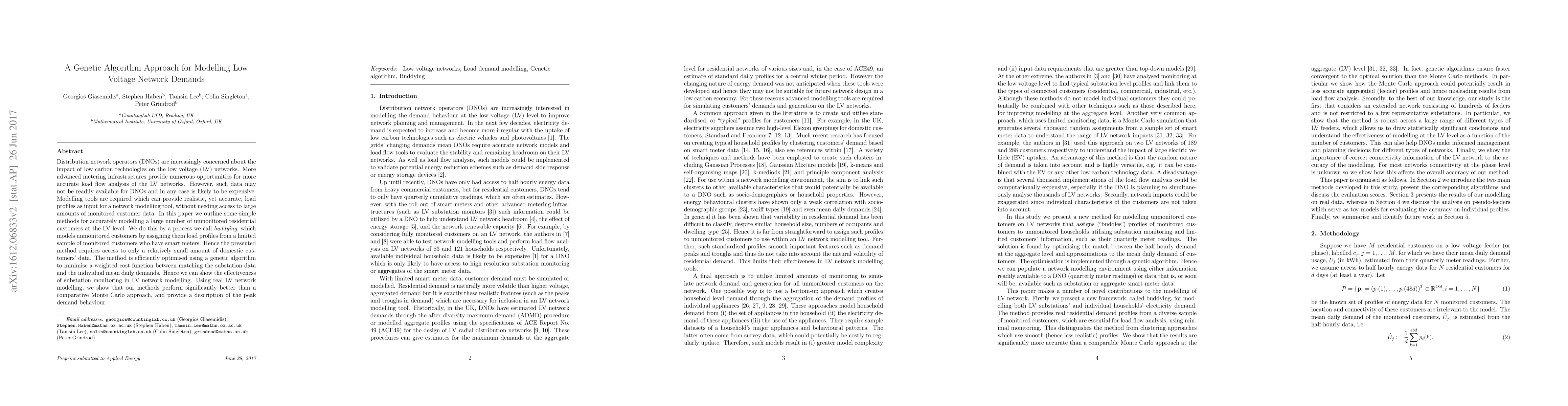 This paper proposes a genetic algorithm approach for modelling low voltage network demands using a "buddying" method that assigns load profiles from a limited sample of monitored customers to unmonitored ones. The method is optimized to minimize the cost function between substation data and individual mean daily demands, demonstrating better performance than a Monte Carlo approach.