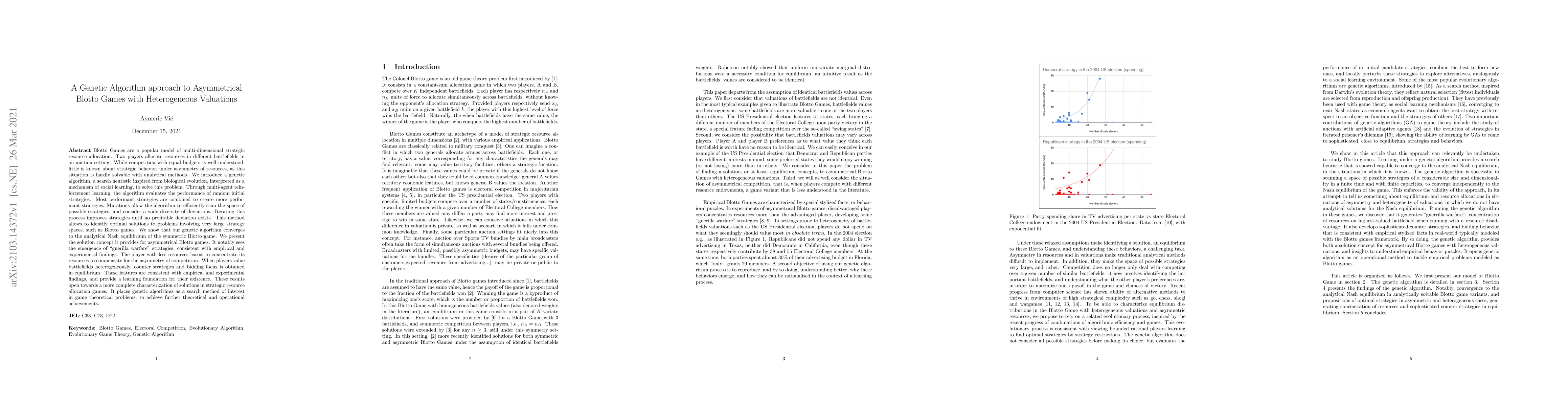 Blotto Games are a popular model of multi-dimensional strategic resource allocation. Two players allocate resources in different battlefields in an auction setting. While competition with equal budgets is well understood, little is known about strategic behavior under asymmetry of resources. We introduce a genetic algorithm, a search heuristic inspired from biological evolution, interpreted as social learning, to solve this problem. Most performant strategies are combined to create more performant strategies. Mutations allow the algorithm to efficiently scan the space of possible strategies, and consider a wide diversity of deviations. We show that our genetic algorithm converges to the analytical Nash equilibrium of the symmetric Blotto game. We present the solution concept it provides for asymmetrical Blotto games. It notably sees the emergence of "guerilla warfare" strategies, consistent with empirical and experimental findings. The player with less resources learns to concentrate its resources to compensate for the asymmetry of competition. When players value battlefields heterogeneously, counter strategies and bidding focus is obtained in equilibrium. These features are consistent with empirical and experimental findings, and provide a learning foundation for their existence.