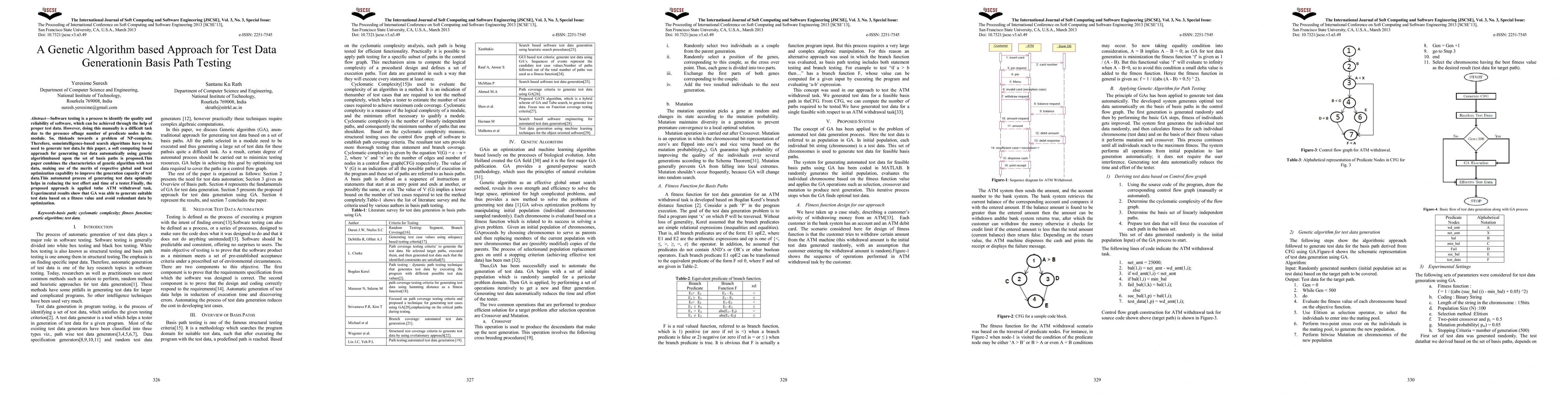 Software Testing is a process to identify the quality and reliability of software, which can be achieved through the help of proper test data. However, doing this manually is a difficult task due to the presence of number of predicate nodes in the module. So, this leads towards a problem of NP-complete. Therefore some intelligence-based search algorithms have to be used to generate test data. In this paper, we use a soft computing based approach, genetic algorithm to generate test data based on the set of basis paths. This paper combines the characteristics of genetic algorithm with test data, making use of the merits of respective global and local optimization capability to improve the generation capacity of test data. This automated process of generating test data optimally helps in reducing the test effort and time of a tester. Finally, the proposed approach is applied for ATM withdrawal task. Experimental results show that genetic algorithm was able to generate suitable test data based on a fitness value and avoid redundant data by optimization.