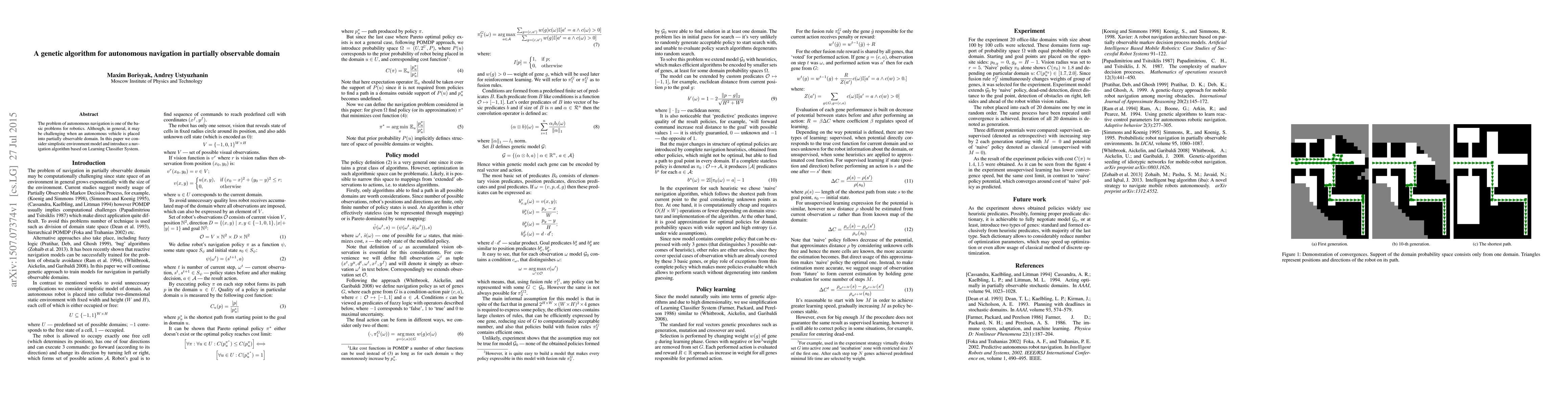 Summary: This paper proposes a navigation algorithm using a Learning Classifier System and genetic algorithm for autonomous vehicles operating in partially observable environments, aiming to address the challenges of such navigation scenarios. The approach is tested on a simplistic environment model.