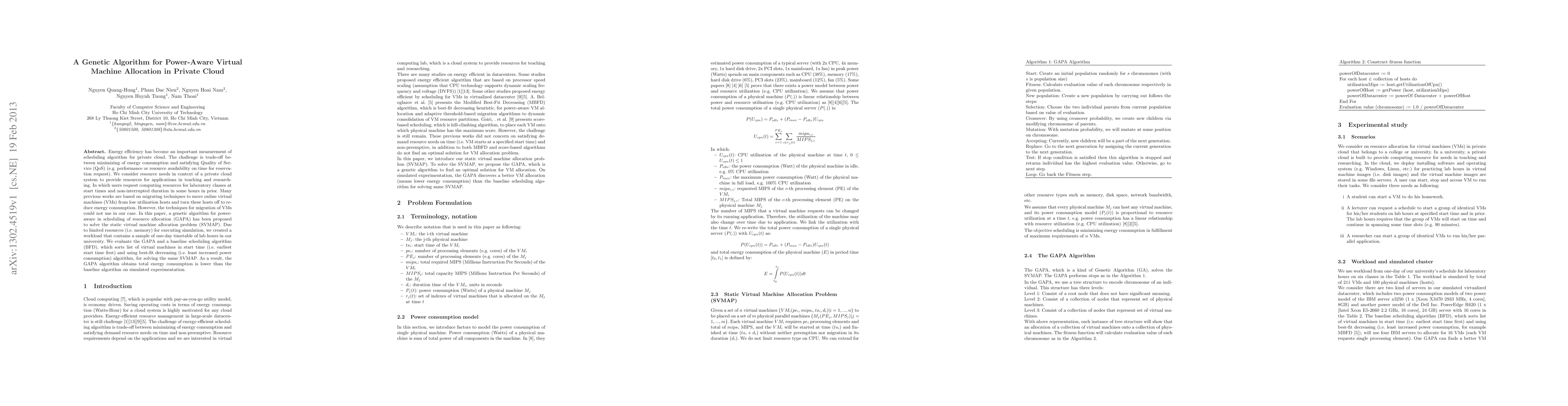 This paper proposes a genetic algorithm for power-aware scheduling of resource allocation (GAPA) to address the static virtual machine allocation problem in private cloud environments, aiming to minimize energy consumption while maintaining Quality of Service. Experimental results show that GAPA achieves lower energy consumption compared to a baseline best-fit decreasing algorithm.