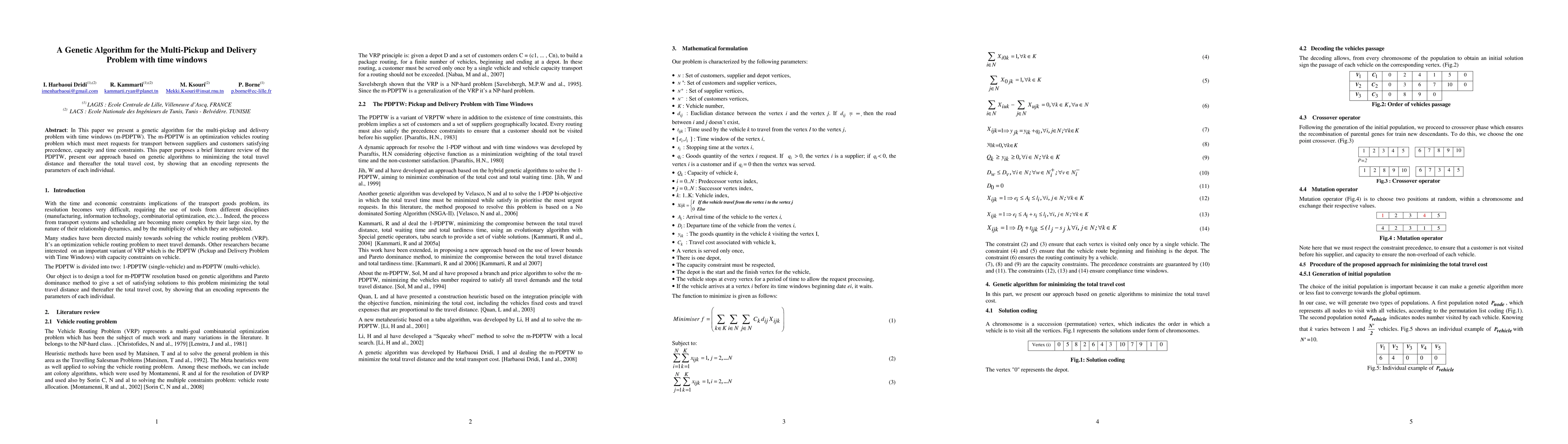 Summary: This paper proposes a genetic algorithm to optimize the multi-pickup and delivery problem with time windows (m-PDPTW), focusing on minimizing travel distance and cost while satisfying constraints. The approach includes a literature review and a detailed encoding method for individual parameters.