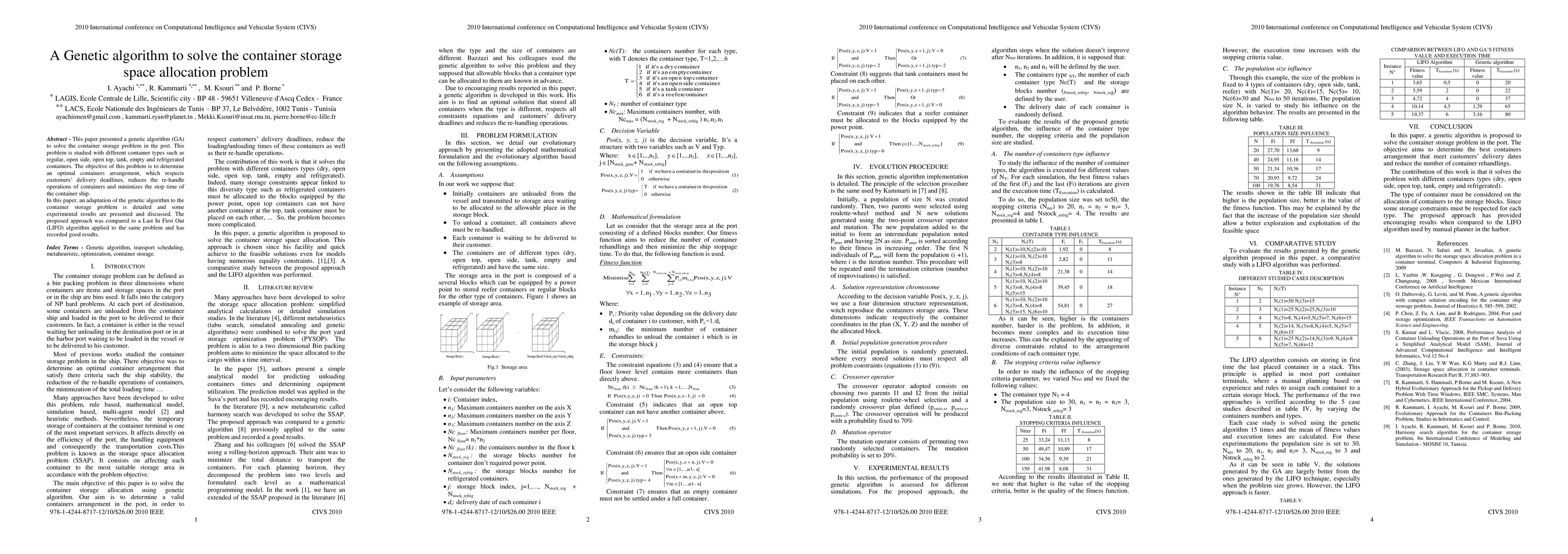 This paper proposes a genetic algorithm to optimize container storage space allocation in ports, considering various container types and aiming to meet delivery deadlines, reduce rehandling, and minimize ship stop time. Experimental results show the method outperforms a Last In First Out (LIFO) algorithm.