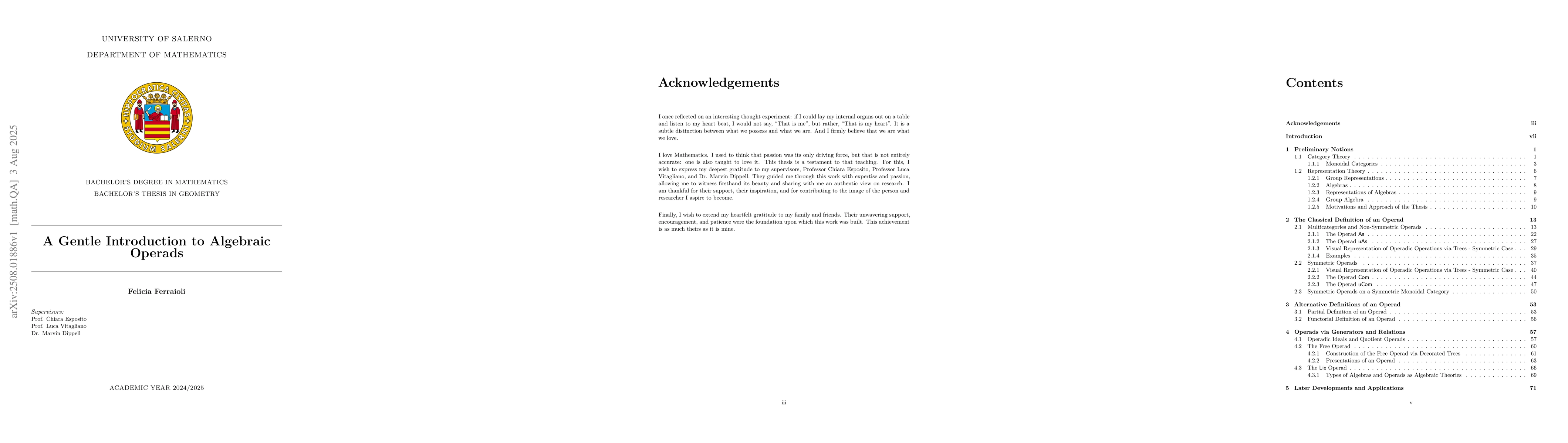 This text, based on the author's Bachelor's thesis, introduces the theory of Algebraic Operads, a mathematical formalism that provides a unifying framework for modern algebra. We demonstrate how the fundamental theories of associative, commutative, and Lie algebras can be fully recovered as categories of representations of three archetypal operads: $\mathsf{As}$, $\mathsf{Com}$ and $\mathsf{Lie}$ -- the so-called 'three graces' of algebra. Following a deductive and self-contained approach, the notion of an operad is initially presented in its classical form, as a single-object multicategory. Subsequently, alternative definitions -- namely, the partial and functorial definitions -- are provided. This framework allows for the extension of classical algebraic notions, such as free objects and quotients, to the operadic context, thereby enabling operads to be formally presented through generators and relations. The central result of this work is the rigorous proof of the correspondence between operads and algebras. We establish isomorphisms of categories between the algebras over the operads $\mathsf{As}$, $\mathsf{Com}$ and $\mathsf{Lie}$, and their respective classical counterparts. This thesis thus highlights how the theory of operads offers a higher-level language for algebra, encoding entire algebraic theories within single mathematical objects. This formalism not only unifies known structures but also lays the foundation for advanced concepts, such as 'algebras up to homotopy,' with applications in fields like theoretical physics and geometry.