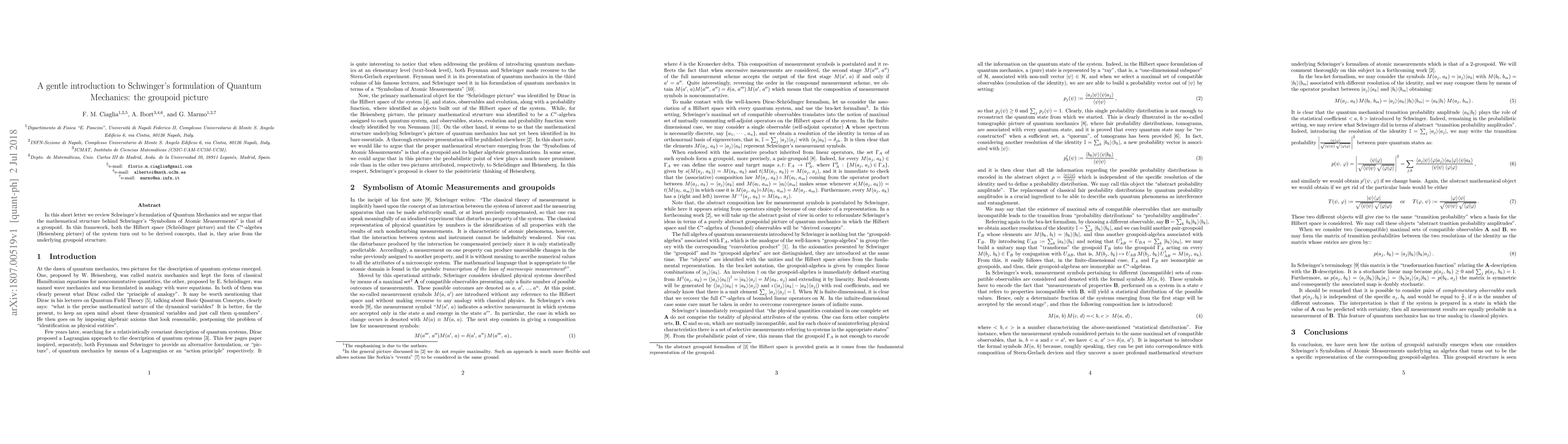 Summary: This paper reviews Schwinger's formulation of quantum mechanics, highlighting that the underlying mathematical structure is a groupoid. It demonstrates that both the Hilbert space and the $C^{*}$-algebra emerge from this groupoid framework.