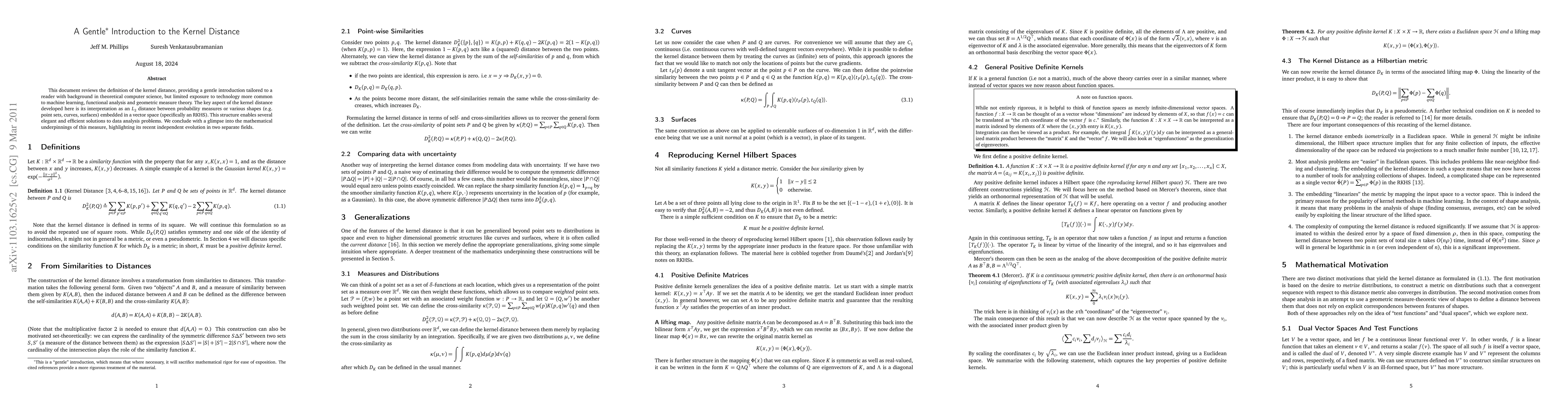 The paper provides a gentle introduction to the kernel distance, focusing on its interpretation as an L_2 distance between probability measures or shapes embedded in a Reproducing Kernel Hilbert Space (RKHS). It discusses curves, surfaces, and positive definite kernels, highlighting the role of RKHS in structuring the kernel distance.