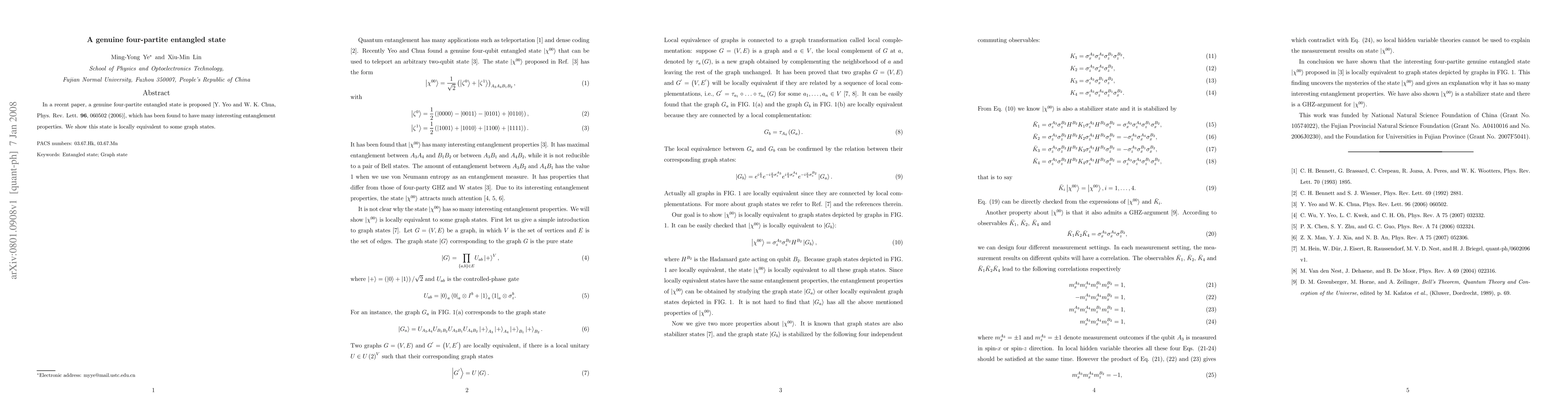 Summary: This paper proposes a genuine four-partite entangled state with notable entanglement properties, demonstrating its local equivalence to certain graph states. This equivalence highlights its potential applications in quantum information processing.