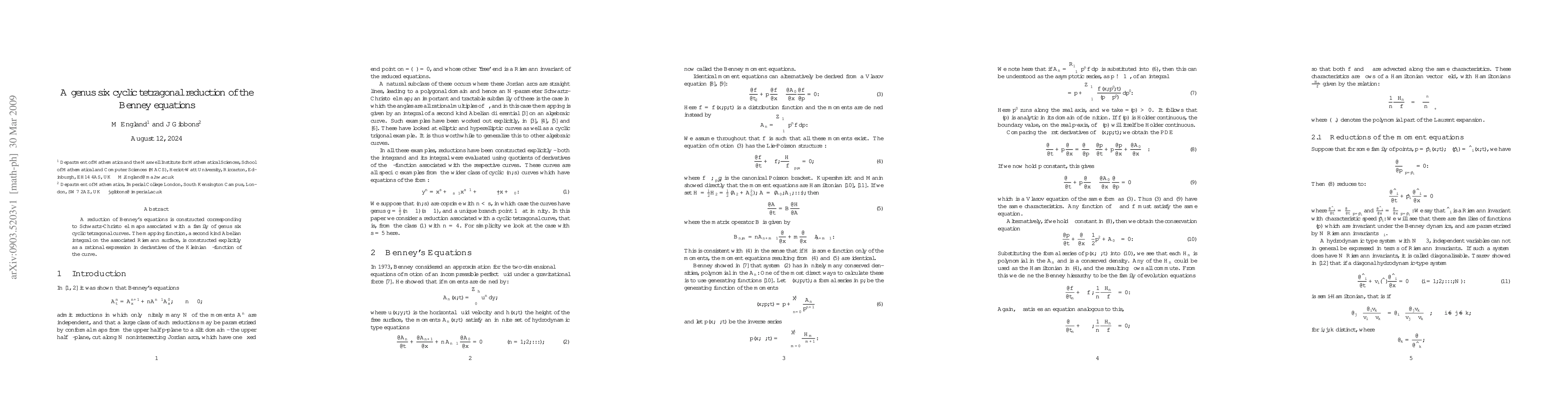A reduction of Benney's equations is constructed corresponding to Schwartz-Christoffel maps associated with a family of genus six cyclic tetragonal curves. The mapping function, a second kind Abelian integral on the associated Riemann surface, is constructed explicitly as a rational expression in derivatives of the Kleinian sigma-function of the curve.