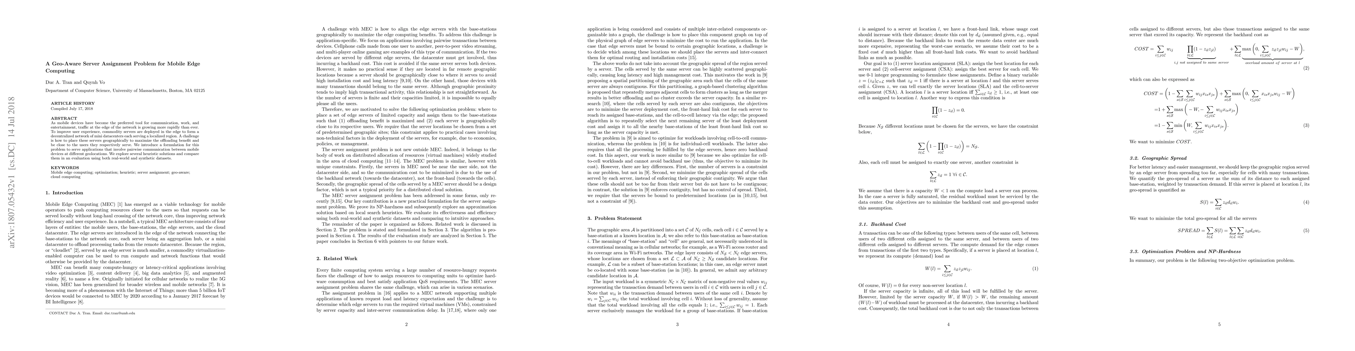 This paper proposes a geo-aware server assignment problem for mobile edge computing to optimize the placement of commodity servers in localized regions to maximize offloading benefits and proximity to users. It evaluates various heuristic solutions using real-world and synthetic datasets to determine the most effective strategies.