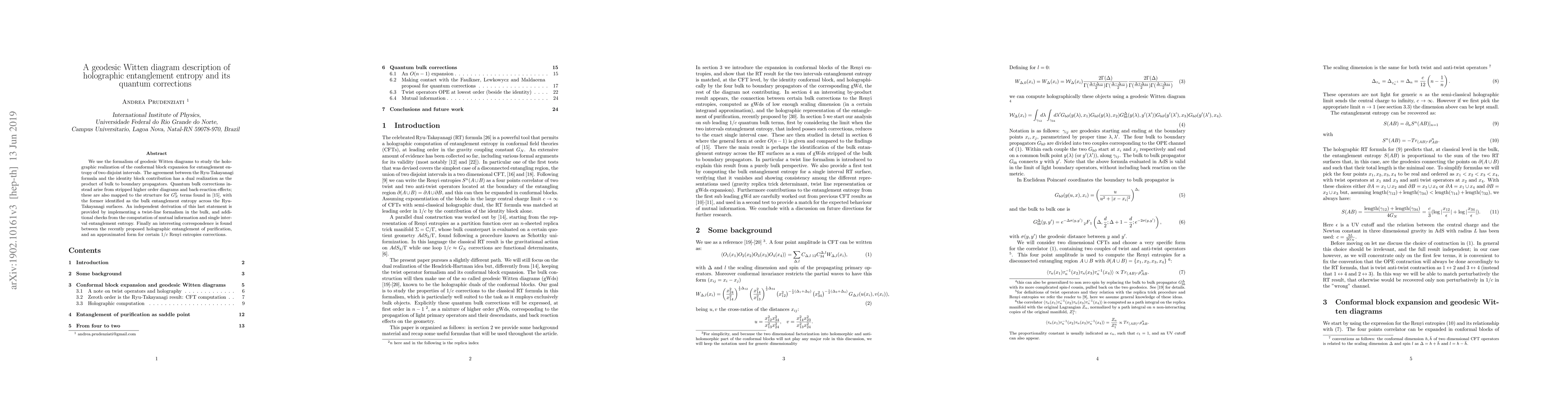 We use the formalism of geodesic Witten diagrams to study the holographic realization of the conformal block expansion for entanglement entropy of two disjoint intervals. The agreement between the Ryu-Takayanagi formula and the identity block contribution has a dual realization as the product of bulk to boundary propagators. Quantum bulk corrections instead arise from stripped higher order diagrams and back-reaction effects; these are also mapped to the structure for $G_N^0$ terms found in \cite{Faulkner:2013ana}, with the former identified as the bulk entanglement entropy across the Ryu-Takayanagi surfaces. An independent derivation of this last statement is provided by implementing a twist-line formalism in the bulk, and additional checks from the computation of mutual information and single interval entanglement entropy. Finally an interesting correspondence is found between the recently proposed holographic entanglement of purification, and an approximated form for certain $1/c$ Renyi entropies corrections.