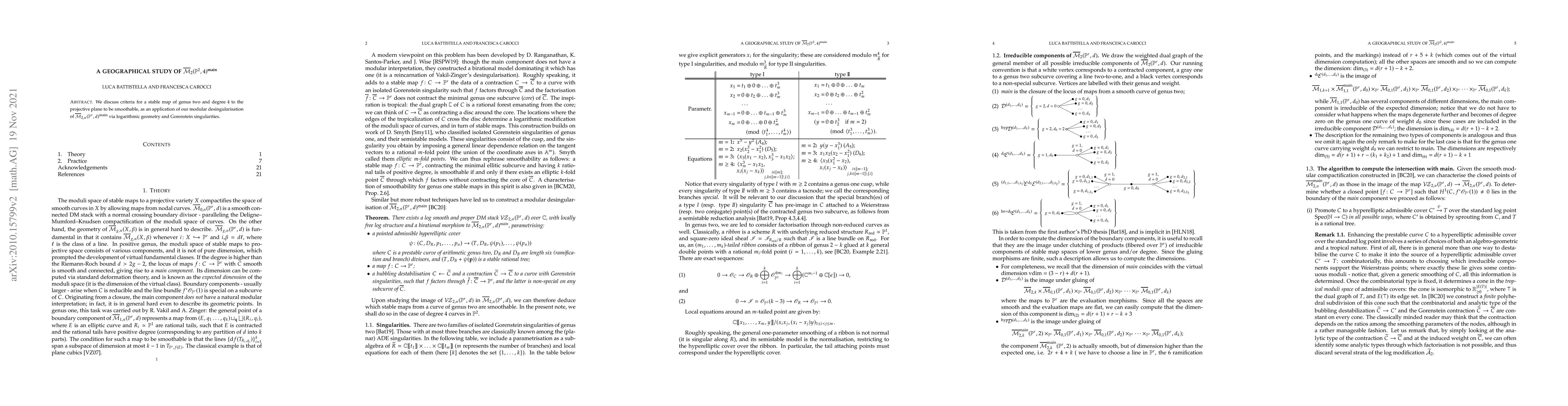 We discuss criteria for a stable map of genus two and degree $4$ to the projective plane to be smoothable, as an application of our modular desingularisation of $\overline{\mathcal M}_{2,n}(\mathbb{P}^r,d)^{\text{main}}$ via logarithmic geometry and Gorenstein singularities.