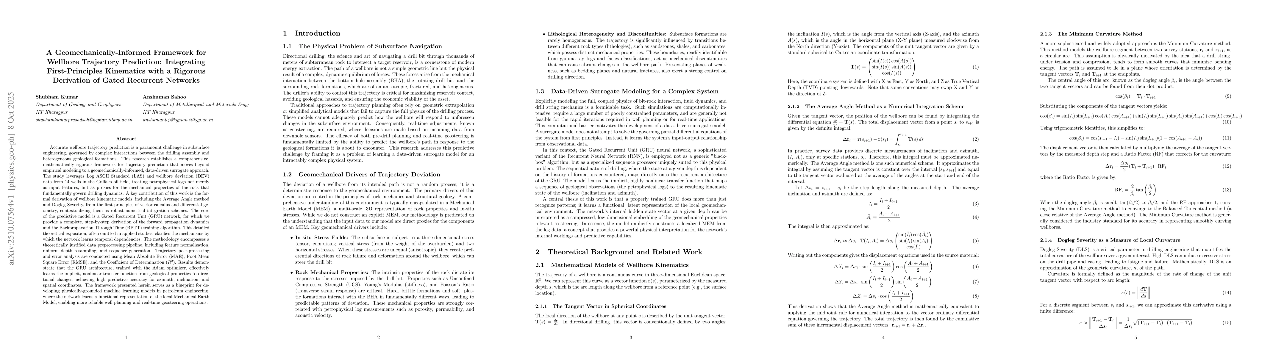 Accurate wellbore trajectory prediction is a paramount challenge in subsurface engineering, governed by complex interactions between the drilling assembly and heterogeneous geological formations. This research establishes a comprehensive, mathematically rigorous framework for trajectory prediction that moves beyond empirical modeling to a geomechanically-informed, data-driven surrogate approach.The study leverages Log ASCII Standard (LAS) and wellbore deviation (DEV) data from 14 wells in the Gulfaks oil field, treating petrophysical logs not merely as input features, but as proxies for the mechanical properties of the rock that fundamentally govern drilling dynamics. A key contribution of this work is the formal derivation of wellbore kinematic models, including the Average Angle method and Dogleg Severity, from the first principles of vector calculus and differential geometry, contextualizing them as robust numerical integration schemes. The core of the predictive model is a Gated Recurrent Unit (GRU) network, for which we provide a complete, step-by-step derivation of the forward propagation dynamics and the Backpropagation Through Time (BPTT) training algorithm. This detailed theoretical exposition, often omitted in applied studies, clarifies the mechanisms by which the network learns temporal dependencies. The methodology encompasses a theoretically justified data preprocessing pipeline, including feature normalization, uniform depth resampling, and sequence generation. Trajectory post-processing and error analysis are conducted using Mean Absolute Error (MAE), Root Mean Square Error (RMSE), and the Coefficient of Determination (R2).