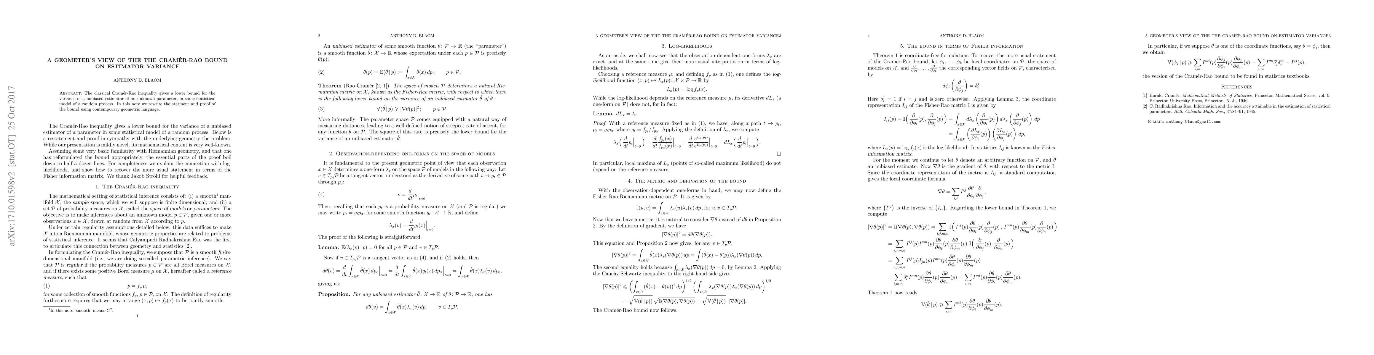 This paper reinterprets the classical Cramér-Rao inequality using modern geometric language, providing a new perspective on the lower bound for the variance of unbiased estimators in statistical models. The geometric approach offers a fresh understanding of the fundamental statistical result.