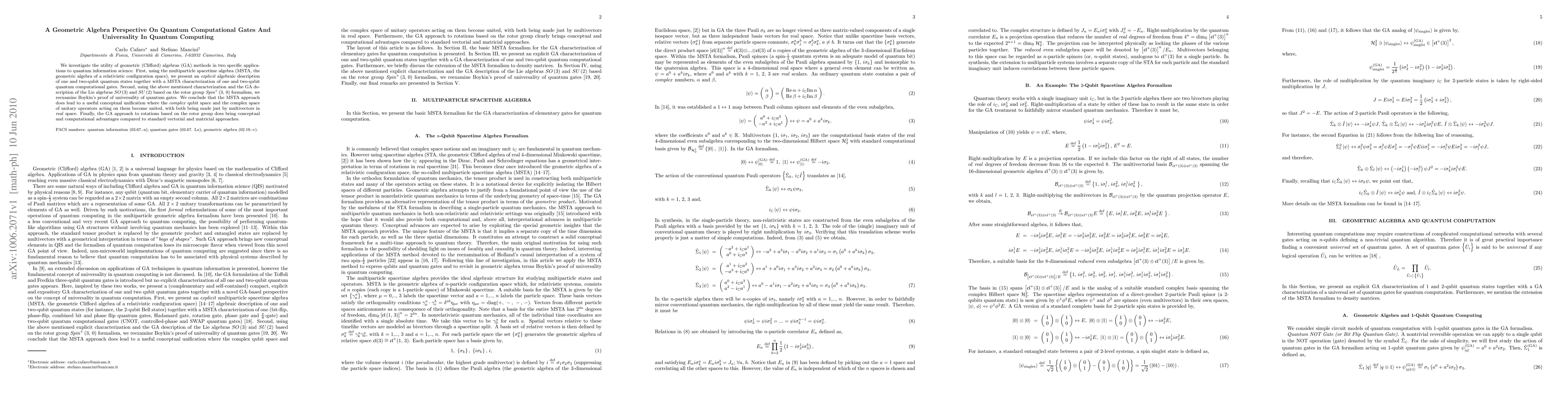 We investigate the utility of geometric (Clifford) algebras (GA) methods in two specific applications to quantum information science. First, using the multiparticle spacetime algebra (MSTA, the geometric algebra of a relativistic configuration space), we present an explicit algebraic description of one and two-qubit quantum states together with a MSTA characterization of one and two-qubit quantum computational gates. Second, using the above mentioned characterization and the GA description of the Lie algebras SO(3) and SU(2) based on the rotor group Spin+(3, 0) formalism, we reexamine Boykin's proof of universality of quantum gates. We conclude that the MSTA approach does lead to a useful conceptual unification where the complex qubit space and the complex space of unitary operators acting on them become united, with both being made just by multivectors in real space. Finally, the GA approach to rotations based on the rotor group does bring conceptual and computational advantages compared to standard vectorial and matricial approaches.