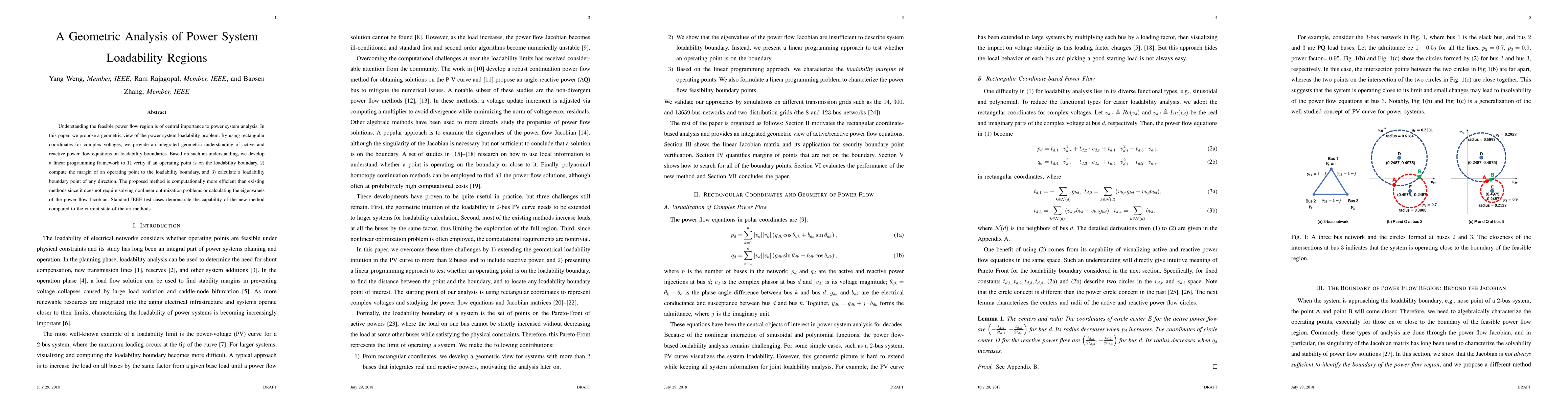 Understanding the feasible power flow region is of central importance to power system analysis. In this paper, we propose a geometric view of the power system loadability problem. By using rectangular coordinates for complex voltages, we provide an integrated geometric understanding of active and reactive power flow equations on loadability boundaries. Based on such an understanding, we develop a linear programming framework to 1) verify if an operating point is on the loadability boundary, 2) compute the margin of an operating point to the loadability boundary, and 3) calculate a loadability boundary point of any direction. The proposed method is computationally more efficient than existing methods since it does not require solving nonlinear optimization problems or calculating the eigenvalues of the power flow Jacobian. Standard IEEE test cases demonstrate the capability of the new method compared to the current state-of-the-art methods.