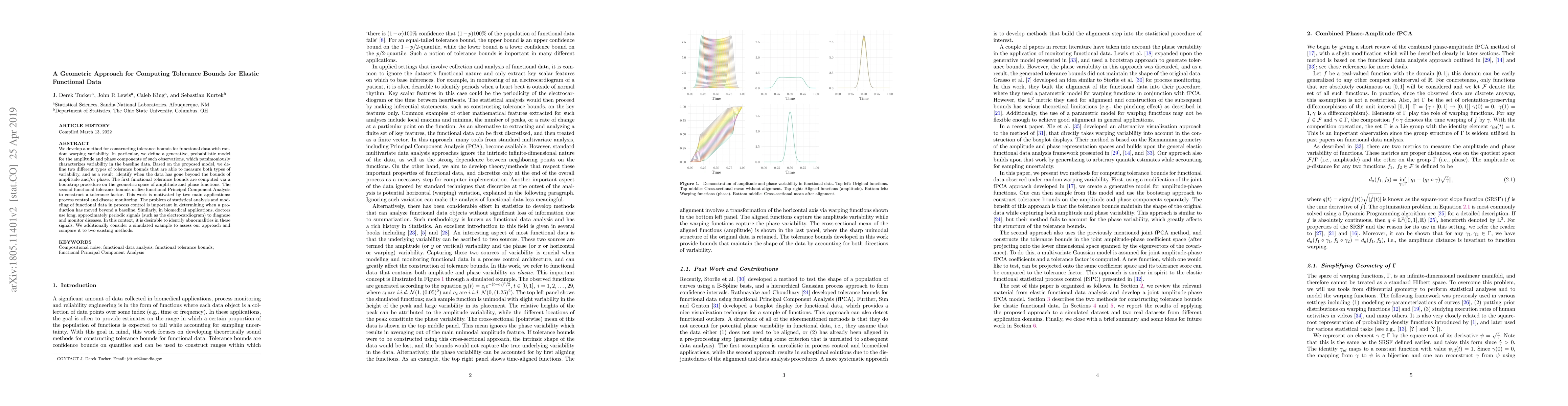 This paper proposes a geometric approach to compute tolerance bounds for elastic functional data, addressing variability in amplitude and phase. It introduces two types of bounds, one via a bootstrap procedure and another using functional PCA, with applications in process control and disease monitoring.