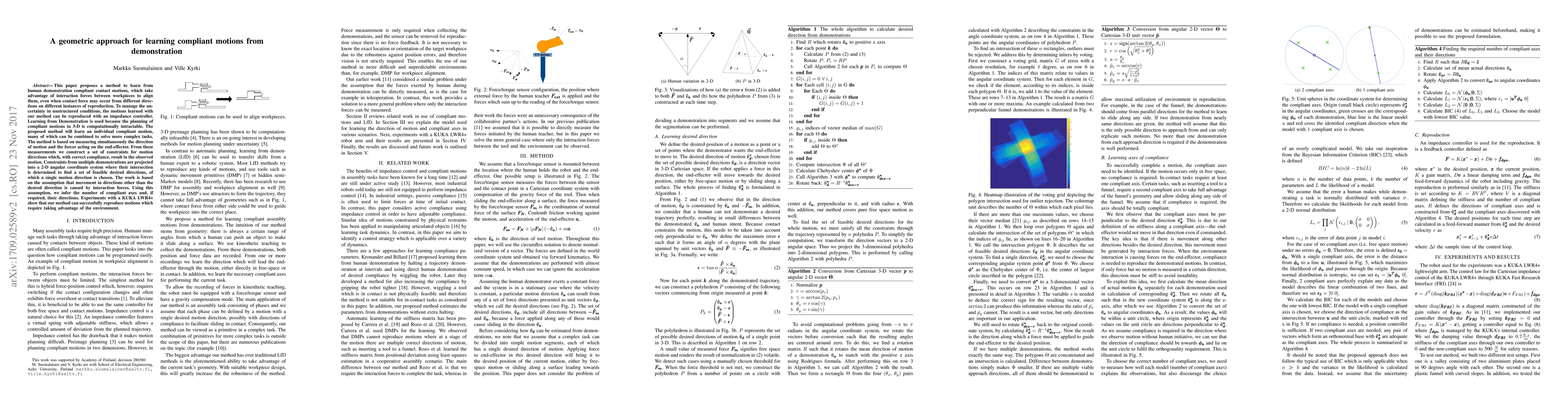 A method to learn compliant contact motions from human demonstration is proposed, using a geometric approach that incorporates interaction forces to align workpieces, enabling the reproduction of complex tasks with an impedance controller.